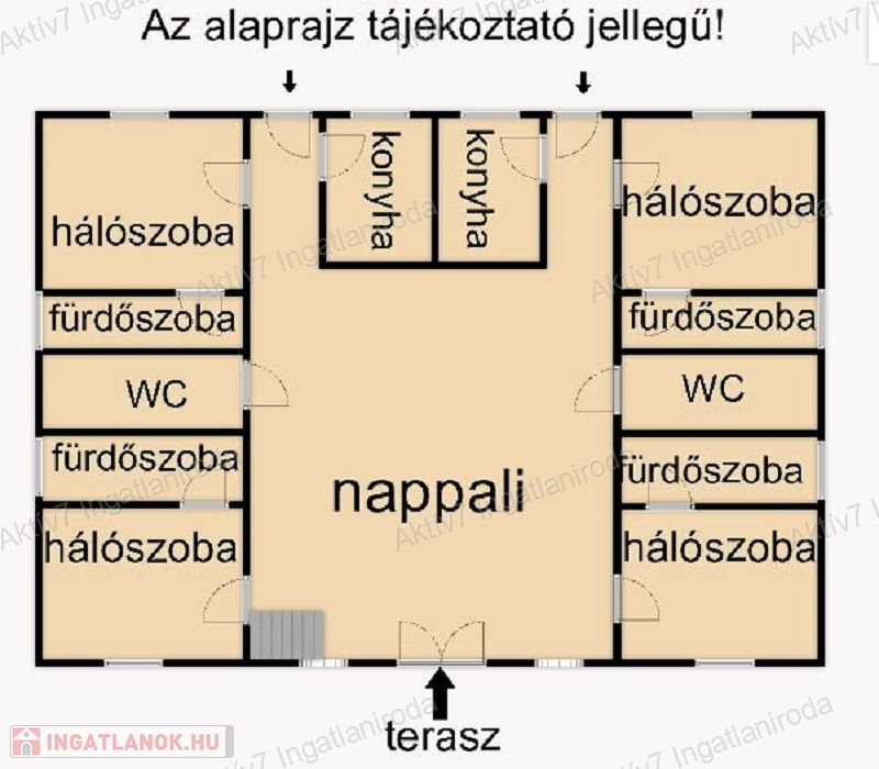 Az 1050 m2-es telken lévő  440 m2 területű  épület (ebből a terasz 80m2) belső két szintes , 4 bejárattal.