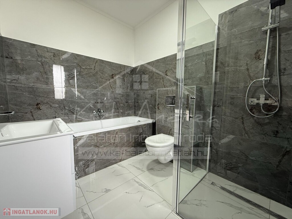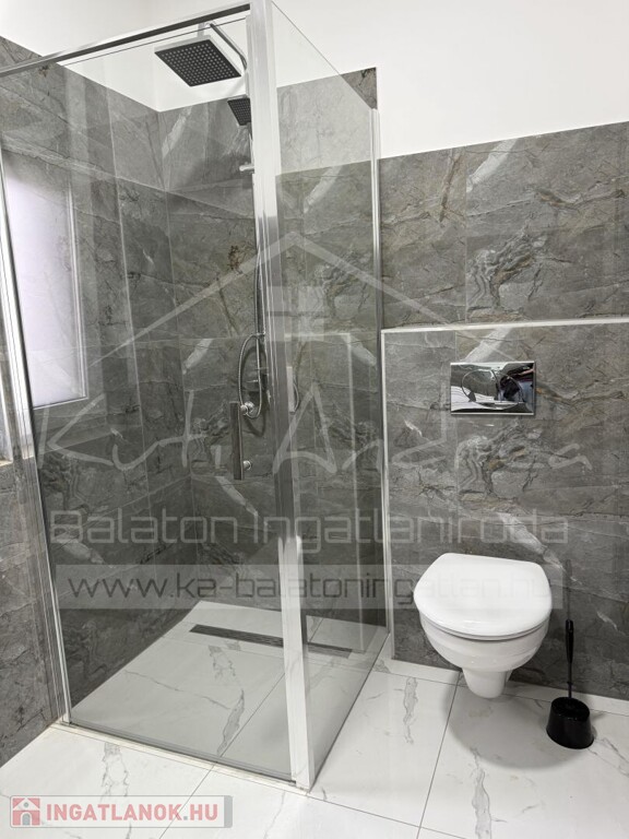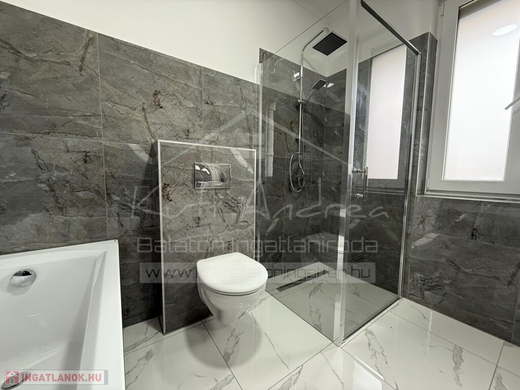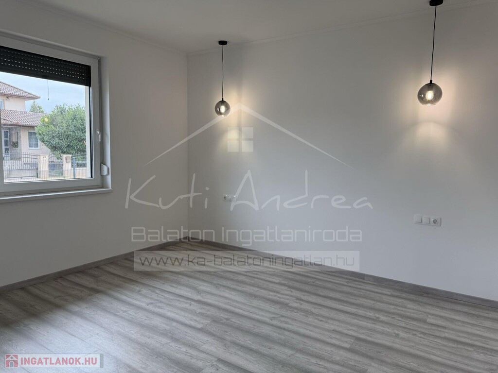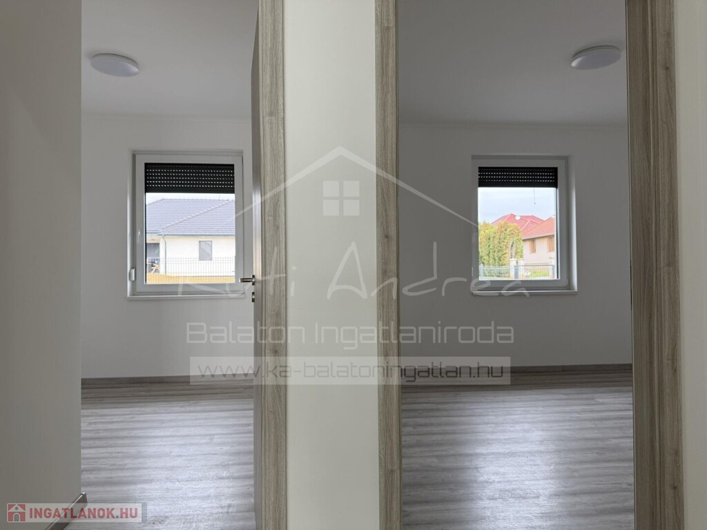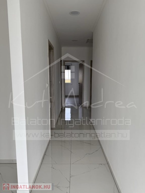 • Elrendezése: 1 előtér, 1 amerikai konyhás nappali étkezővel, 2 szoba, 1 közös fürdővel (tusolós, toalettel), 1 szülői hálószoba saját fürdővel (kád és tusoló, toalettel), 1 mosókonyha/gépház, folyosó, 1 terasz, melyről lehet látni még a Balatont is.