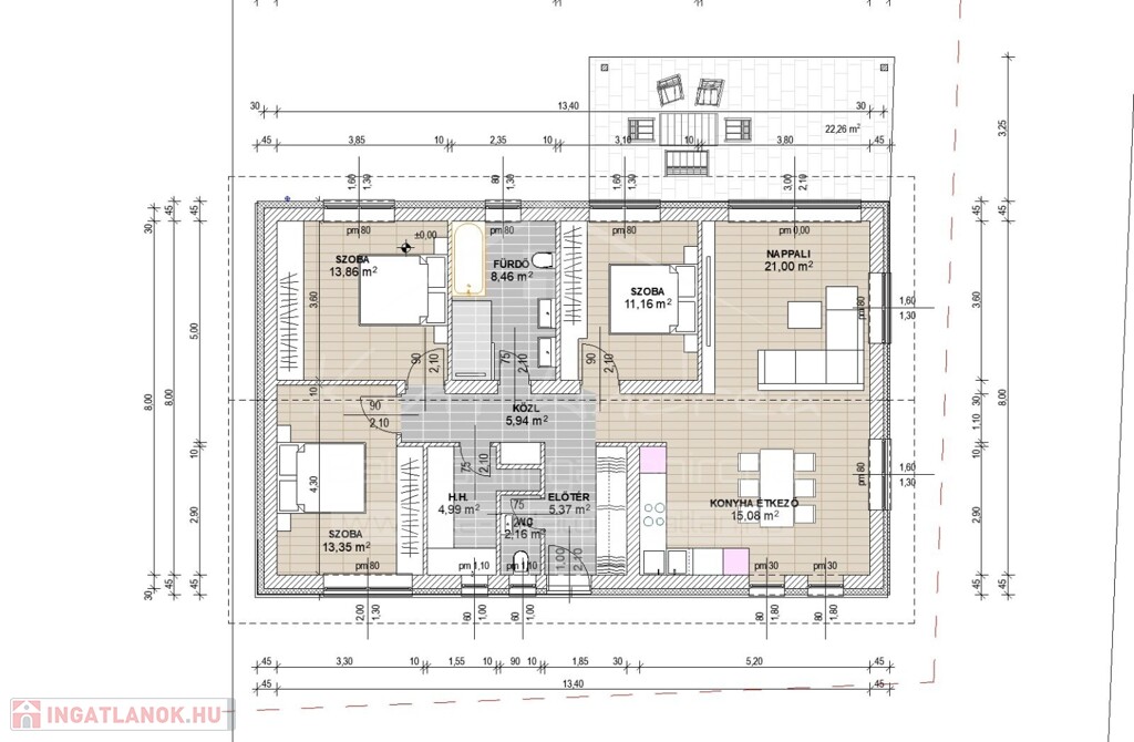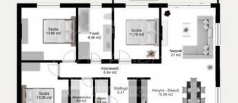 • Elosztás: 3 szoba + amerikai konyhás nappali, mosókonyha, 1 kisebb és egy nagyobb fürdő, előtér és közlekedő. A kisebb fürdő az egy toalett mosdóval és tusolóval lesz kialakítva. Ezt a modósitást még a megadott terven nem látni, de pótoljuk.