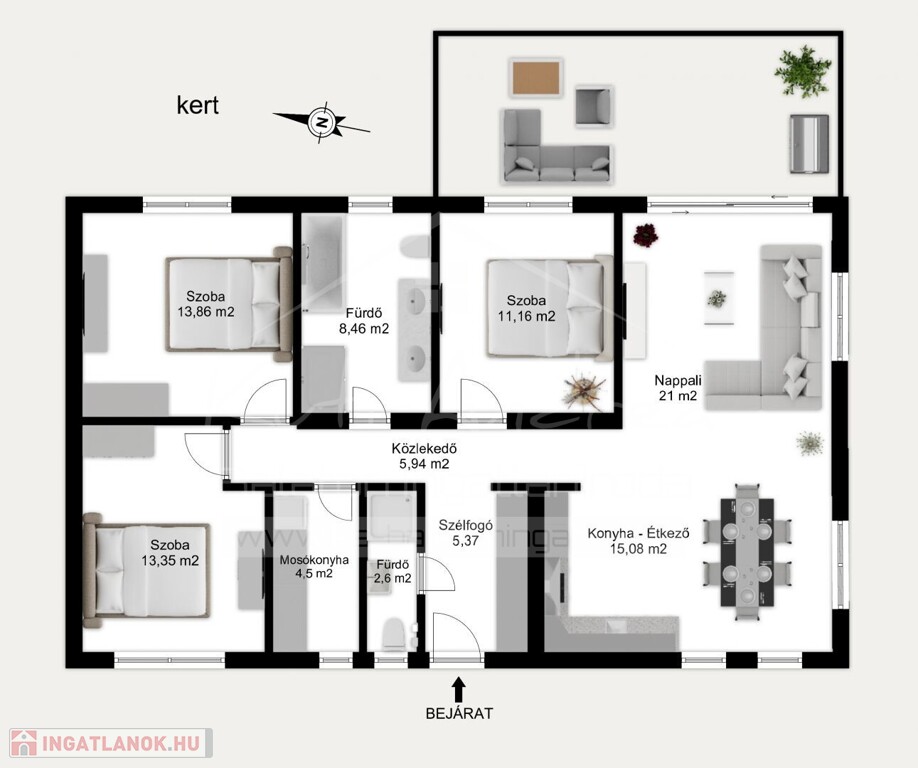 Ezt a lehetőséget ajánlom családosoknak, vagy időssebbeknek, hisz földszintes és még lehetőséget ad a kerten belüli beépítésre.