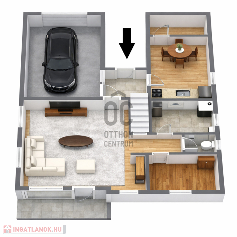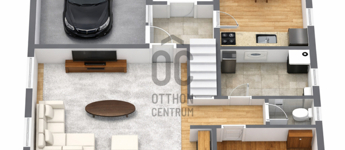 A földszinten egy tágas nappali, egy külön nyíló szoba, egy fürdőszoba, külön mellékhelyiség, valamint egy világos, jól használható konyha található, a garázs pedig közvetlenül kapcsolódik az épülethez, ami kényelmes parkolást biztosít.