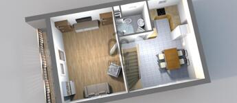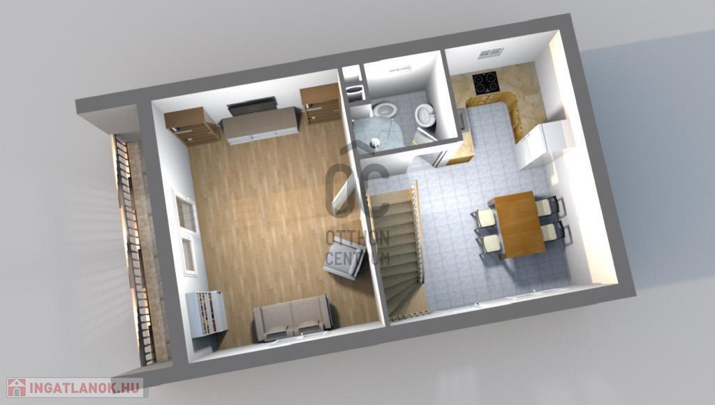 Földszint: előszoba, konyha–étkező, zuhanyzós fürdőszoba WC-vel, Nappali
