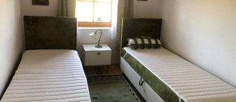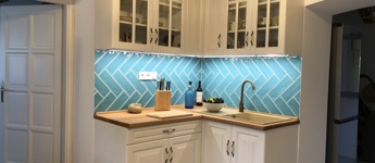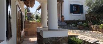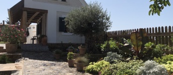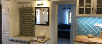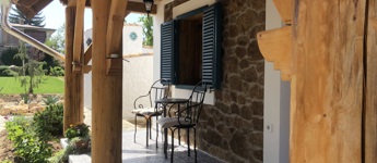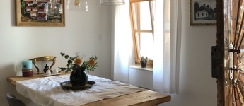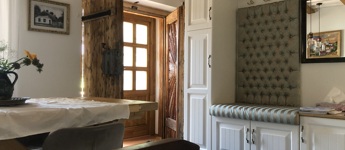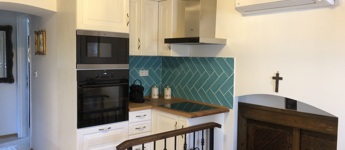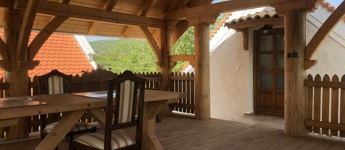 A ház központi tere a napfényben úszó fa körterasz, melyhez kényelmes nappali és egy fürdőszoba kapcsolódik. A konyhában a tömörfa konyhabútor AEG gépekkel és kézzel készített kerámia burkolatokkal egészül ki, ami valódi mestermunka.