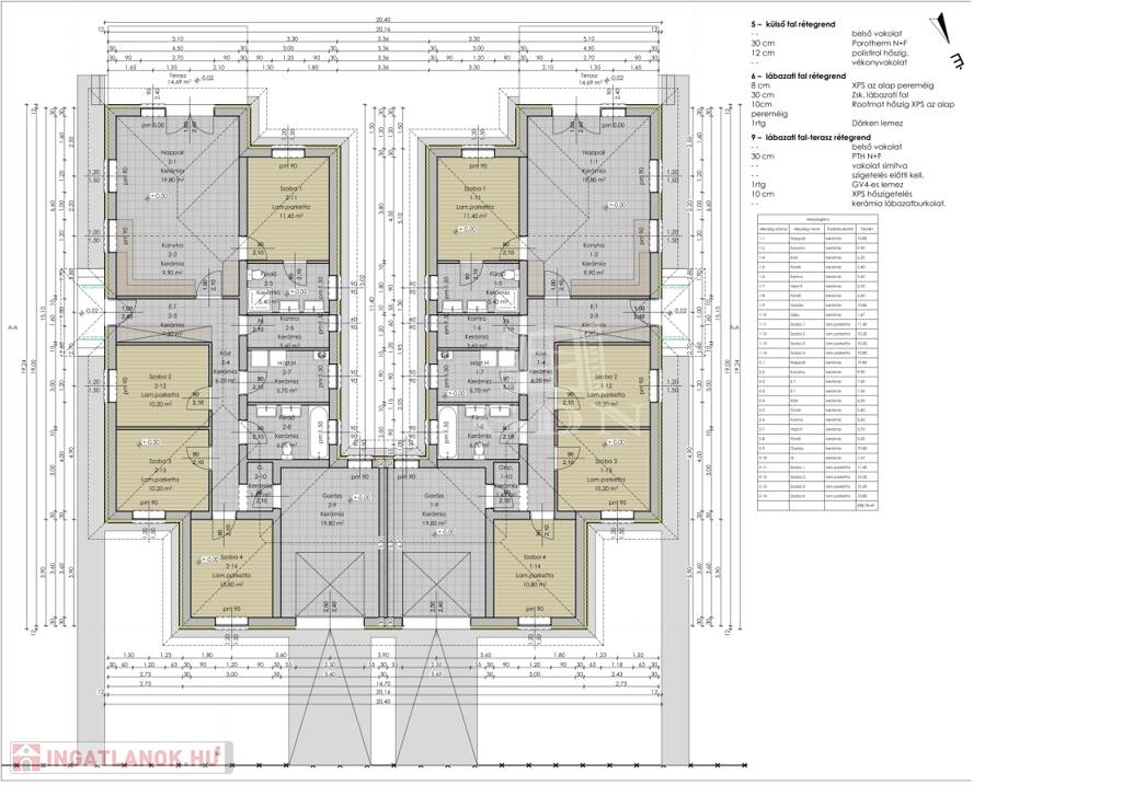 Mindkét házrész nettó 128 m²-es, azonos méretű 541 m²-es kizárólagos használatú telekrészekkel, 4 külön hálószobával, amerikai konyhás nappalival, illetve két fürdőszobával és egy 19,8 m²-es garázzsal.