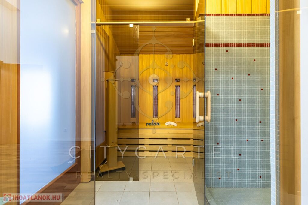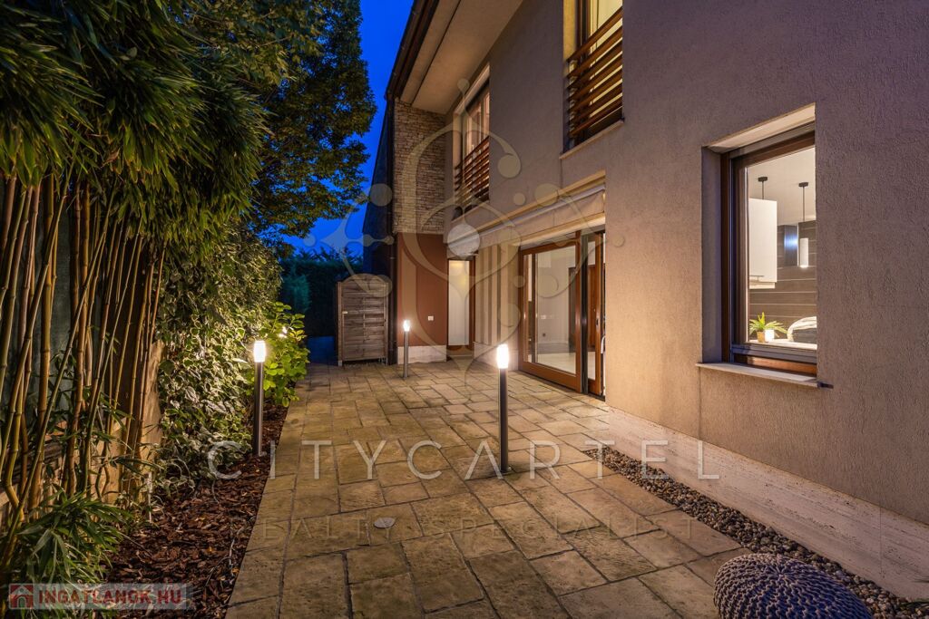 E ingatlanhoz 205/350 tulajdoni hányad tartozik. Ezen belül 305 nm privát, parkosított kert áll rendelkezésre, amely közvetlen kapcsolatot biztosít a két hatalmas teraszhoz és a saját wellness-részleghez