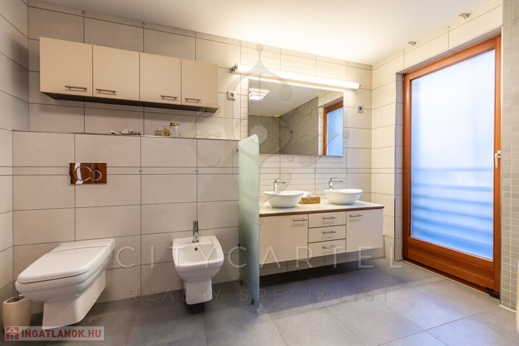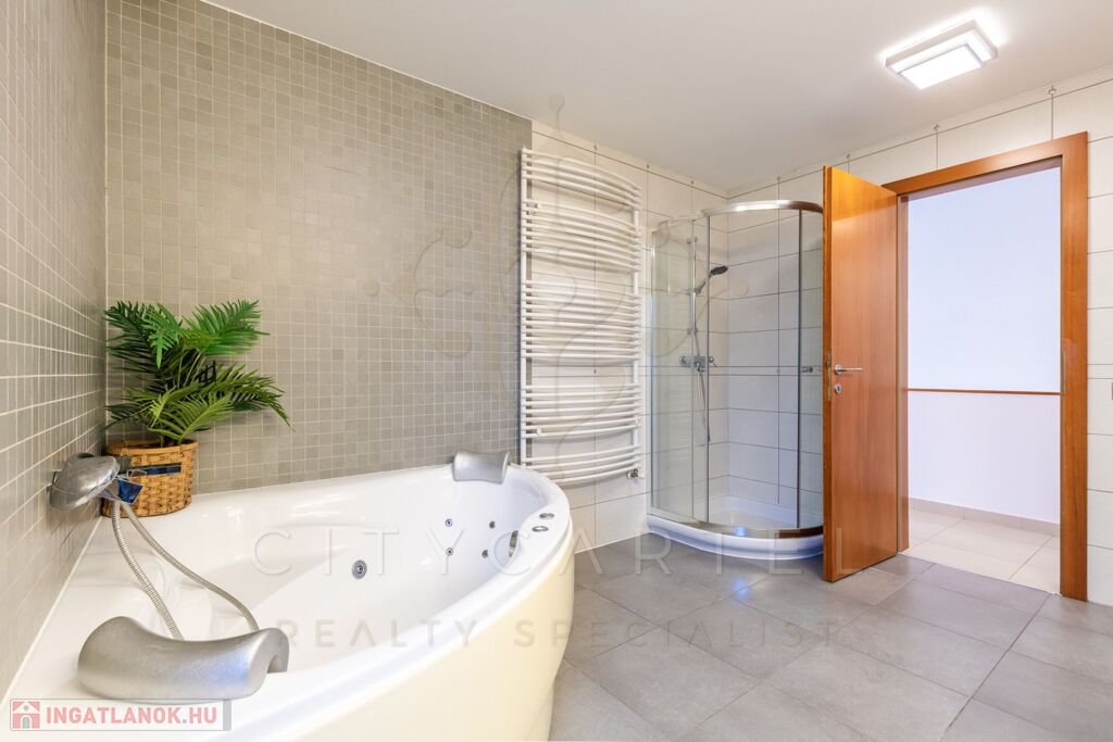 Fürdőszoba: Prémium burkolatokkal, sarokkáddal, zuhanyzóval, WC-vel és bidével felszerelve.