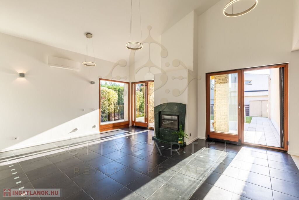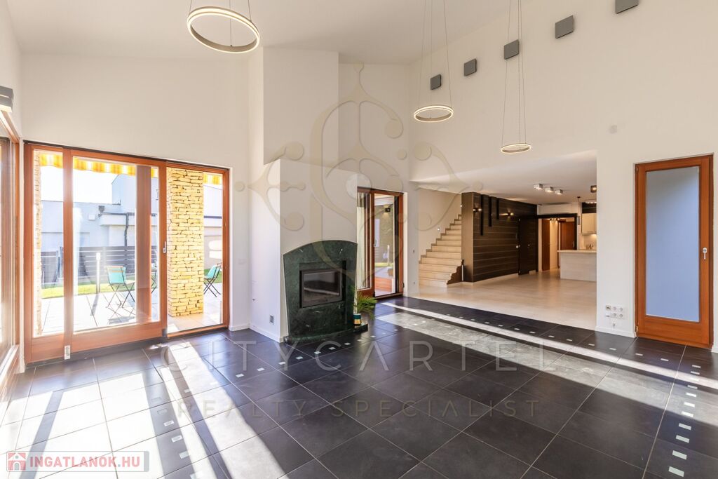 Amerikai konyhás nappali: Fatüzeléses gyönyörű kandallóval, világos és barátságos tágas térrel, nagy belmagassággal, amely több irányból közvetlen terasz (40 és 57 nm-es) - kertkapcsolattal rendelkezik.