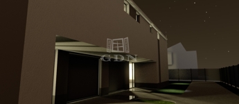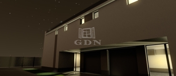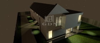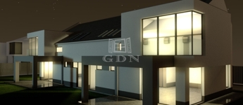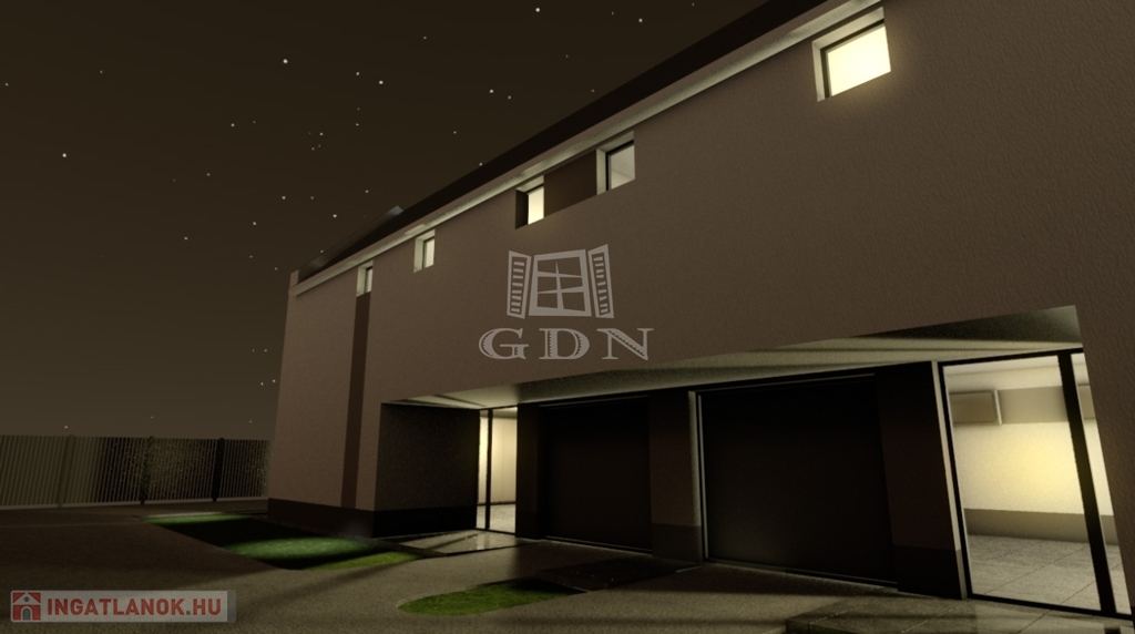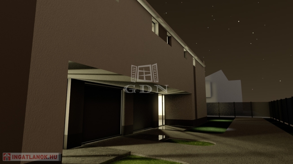 Az utcafronti, előkertes ikerházfél (1. számú lakóház) 372 m2-es telekrészen épült, elkerítve a hátsó féltől, garázzsal.