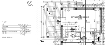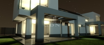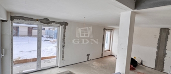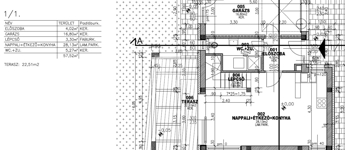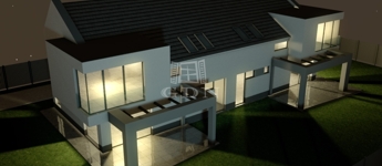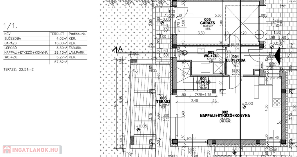előszoba 4 m2, nappali-étkező+ konyha 28 m2, zuhanyozó +WC (5,27 m2), emeletre vezető lépcsőtér 3,3 m2, garázs 17,4 m2, plusz egy 22,5 m2-es terasz került kialakításra.