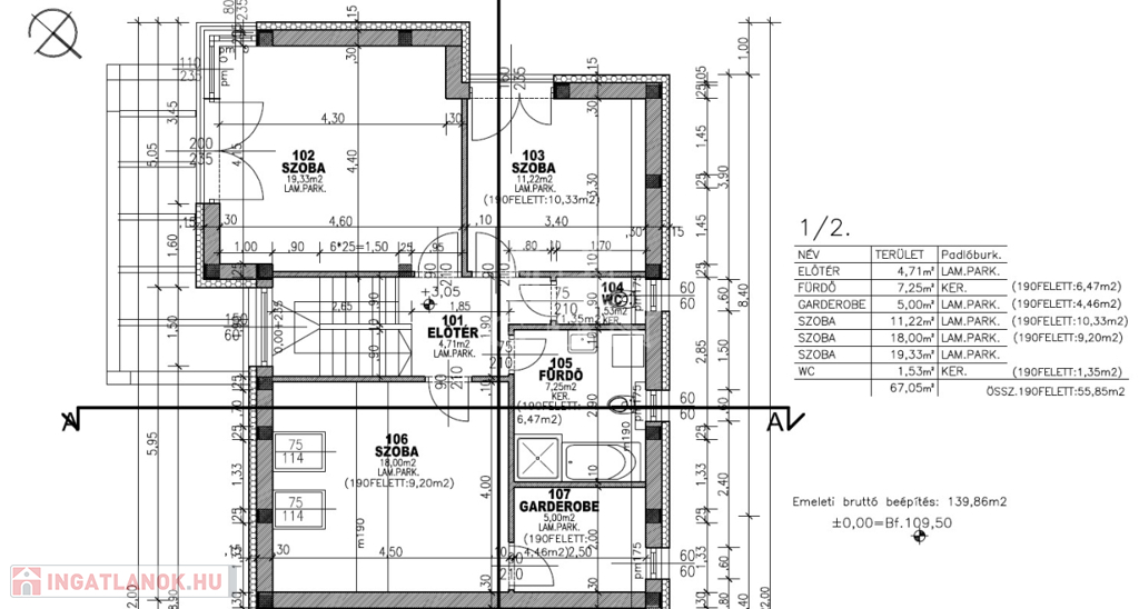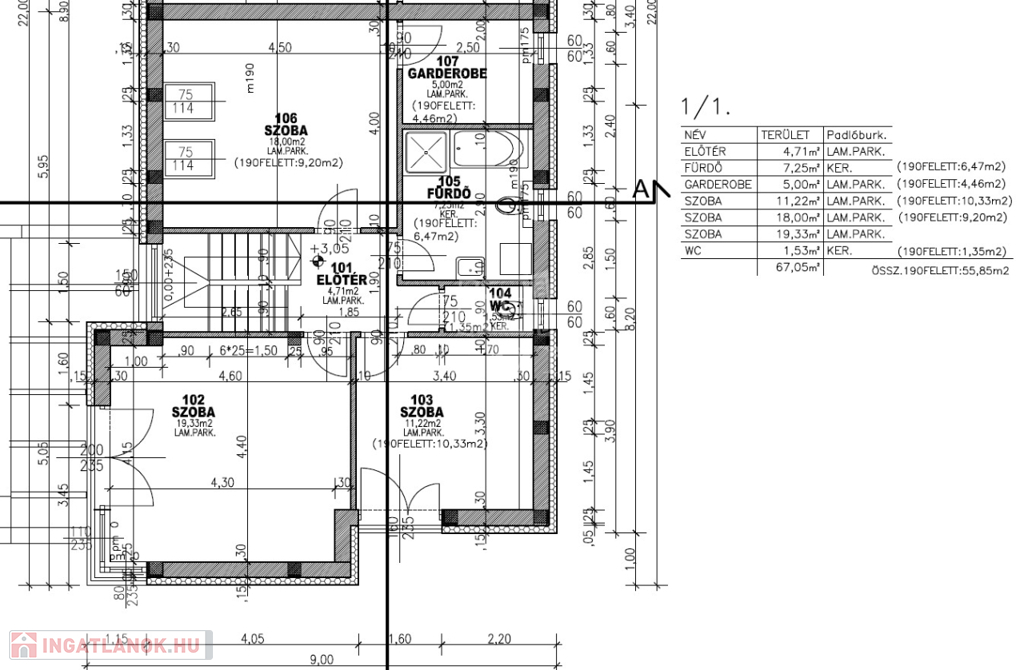 közlekedő-lépcsőtér 9,4 m2, 3 szoba (19,33 m2, 11,22 m2, 9,20 m2), fürdőszoba (7,25 m2), WC (1,53 m2), gardrób (5 m2).