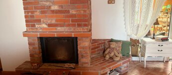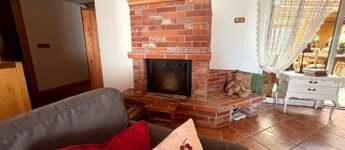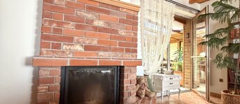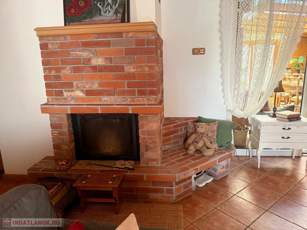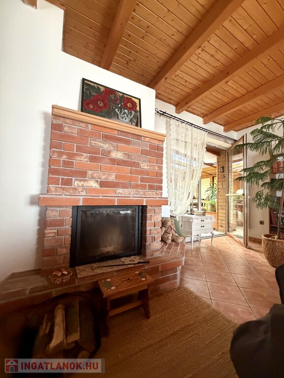 A nappali hangulatát meghatározza a vízteres kandalló, amely a fűtési rendszer része. A látszó fa födém és a meleg burkolatok karakteres, otthonos atmoszférát adnak.