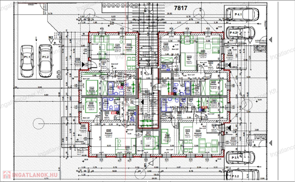 A földszinten 4 db saját kerttel rendelkező ingatlan található, 3db nappali + 2 hálószobás, illetve 1db nappali + 1 hálószobás lakás. Mindegyik lakáshoz saját tároló és 2 db parkoló tartozik! A tároló és a parkolók a vételár részét képezik!