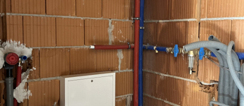 Fűtése 9,5 KW-os hőszivattyúkról ,padlófűtés, használati meleg víz és lakásonként 2db beltéri klíma egységek is erről üzemelnek.