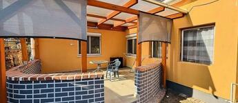 A házrészhez tartozik egy 20 nm-es nagy fedett terasz valamit egy szerelő aknával ellátott garázs.
