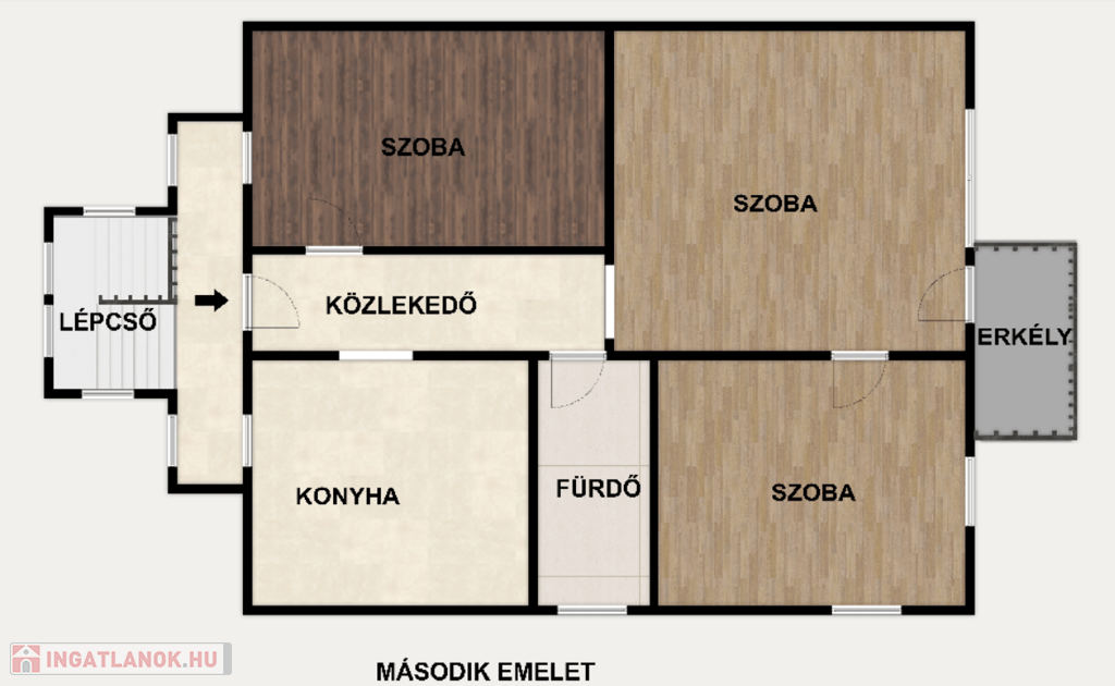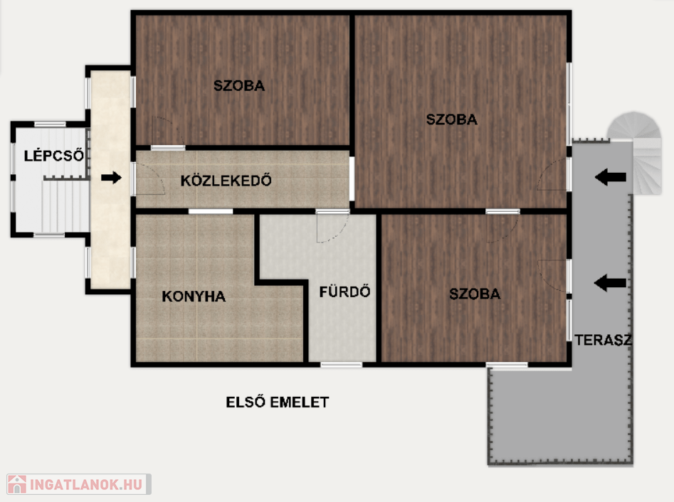 A felső két szint a belső lépcsőházból közelíthető meg, jól szeparált, tágas terekkel és remek elrendezéssel.