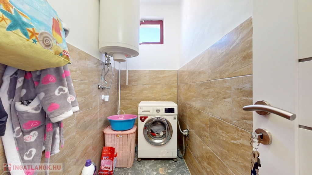 A belső terek világosak, és tágasak, modern burkolatokkal és letisztult stílussal kialakítva. A nappali és étkező ideális helyszín a közös családi pillanatokhoz, míg a praktikus elrendezés könnyűvé teszi a berendezést és a mindennapi használatot. A fürdőszoba és a WC külön helyiségben található, ami növeli a kényelmet és a funkcionalitást, emellett egy különálló mosókonyha is kialakításra került, amely segíti a háztartási teendők hatékony szervezését.