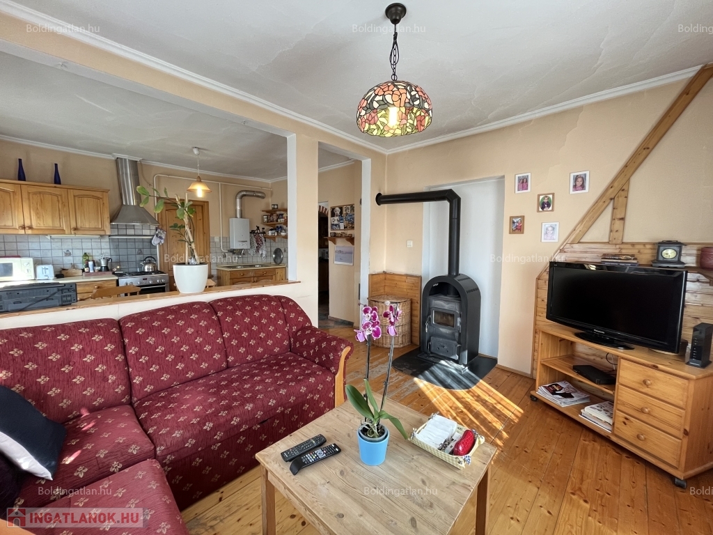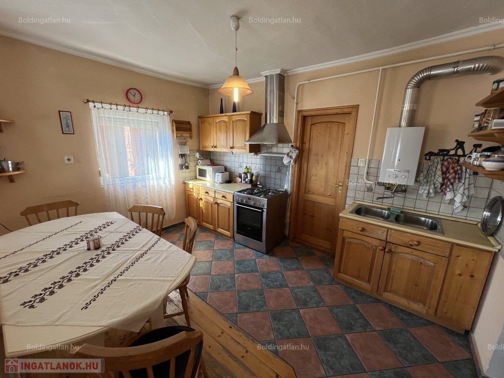 Enyingen, csendes utcában lévő 93 m2-es családi ház – a képeken látható műszaki állapotban – eladó. A lakóházban előtér, nappali-konyha-étkező, 2 szoba, fürdőszoba, wc, kamra helyiségek kerültek kialakításra, illetve tartozik hozzá egy fedett terasz is. A tetőtérben 1 db nagy szoba van, valamint egy kis gardrób kerültek kialakításra, valamint a padlástér is használható még. Az épület fűtése gázkonvektorokkal, valamint a nappaliban lévő kályhával megoldott, a melegvíz ellátást Vaillant típusú átfolyós gáz vízmelegítő biztosítja. Az udvaron fedett tároló, továbbá 2 személyautónak alkalmas garázs találhatóak. Telek: 901 m2