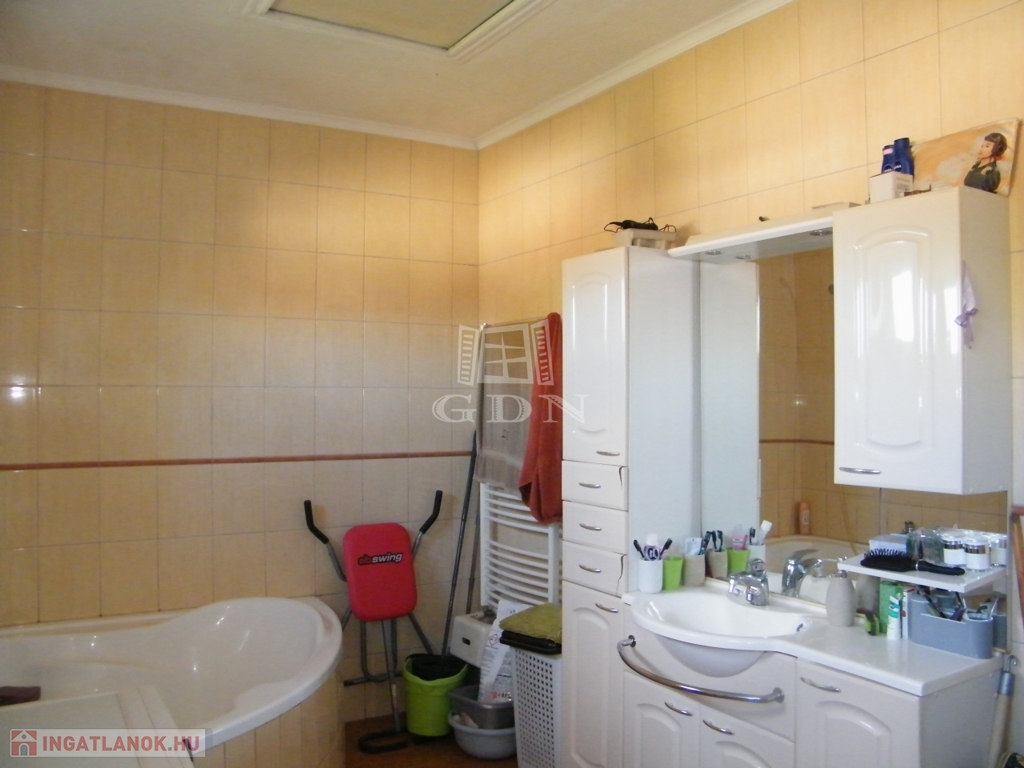 Elrendezés az emeleten két 18 nm-es szoba, egy 23 nm-es nappali/étkező és konyha, 9 nm-es kádas fürdőszoba wc-vel, közlekedő és külön wc.