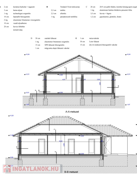 A ház vasalt, szigetelt beton sávalapra épül, 30-as Porotherm tégla tartófalakkal és 10-es Porotherm tégla, vakolt válaszfalakkal.