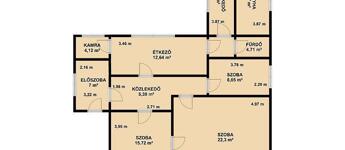 3 szoba, nappali, konyha, fürdőszoba kádas kialakítással + mellékhelyiség, előszoba, közlekedő, tároló.
