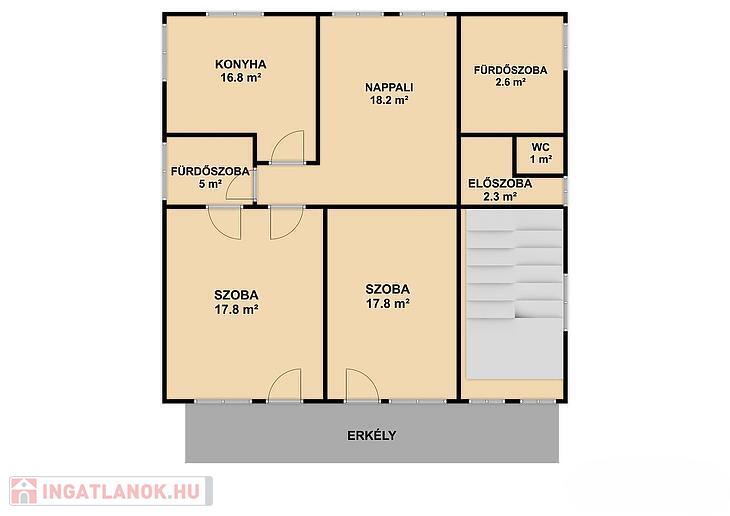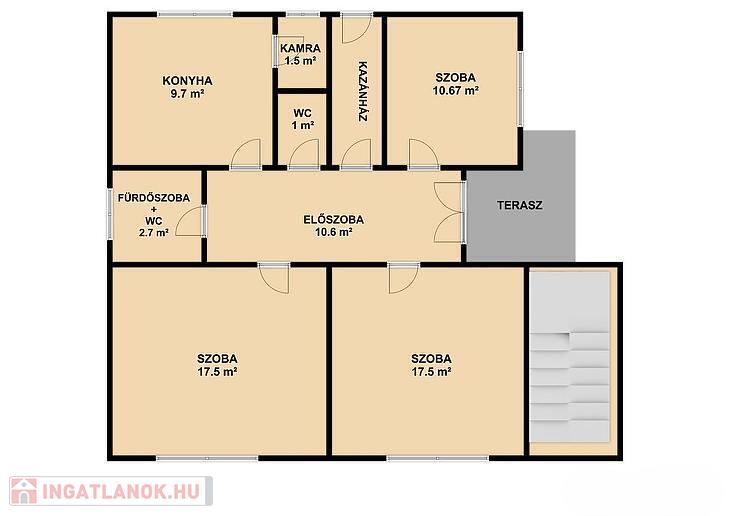 Emelet: 2 szoba, nappali, étkezős konyha, kádas fürdőszoba, mellékhelyiség.