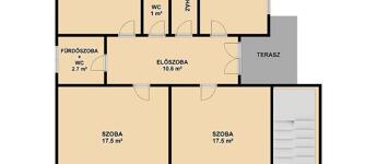 Földszint: 3 szoba, konyha, kamra, kádas fürdőszoba, külön mellékhelyiség, előszoba, közlekedő.