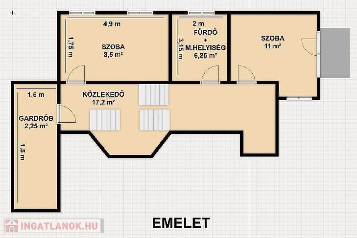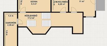 A felső szinten helyet kapott 2 szoba, fürdőszoba mellékhelyiséggel, illetve egy gardróbszoba