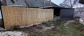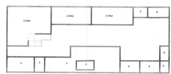 Az udvar osztott, közös tulajdon, vázrajzon feltüntetve, a hazsnálati megosztás. Ez a ház az udvarban az első, utcafronti épület, melyhez 1 db 40 nm nagyságú, fedett garázs is tartoziuk, ezen kívül egy pince is.