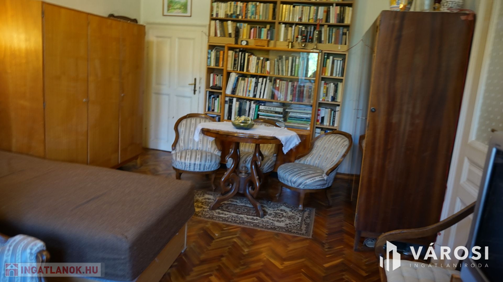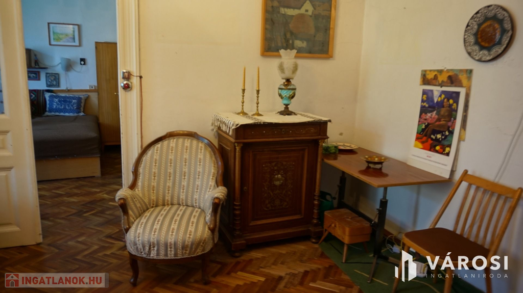 Az egész ingatlant áthatja a polgári életvitelre jellemző berendezés, bútorzat, tágas szobák, a polcokon a temérdek könyv. A lakásnak 2 bejárata van, egyik a kapualjból nyílik, másik a teraszról. A teraszról az előtérbe lépünk először /4 m2/, innen nyílik egy 10 m2-es szoba és a konyha /9 m2/, valamint a toalett /1 m2/. Az egész lakás körbejárható: a kisszobából tovább haladva a két 21 m2-es egymásba nyíló utcai szobába jutunk. A belső szobából nyílik a 4 m2-es fürdőszoba tusolóval és bidével, ami a konyhából is megközelíthető. Ill van egy 4 m2-es kamra, amely szintén a konyhából nyílik. Fűtése gázkonvektoros, a melegvizet átfolyós vízmelegítő szolgáltatja. Kisebb felújításokat végeztek az ingatlanon az utóbbi években, ekkor készült el a fürdőszoba, az utcai fal vízszigetelése, a kapualj hőszigetelése, ill az utcai ablakok cseréje. Viszont egy átfogó felújítás, korszerűsítés az új tulajdonos feladata lesz. Az ingatlan kiváló elhelyezkedése miatt minden gyorsan elérhető: bölcsőde, óvoda, iskola, buszmegálló, üzletek, éttermek, zöldséges, orvosi rendelő, gyógyszertár.