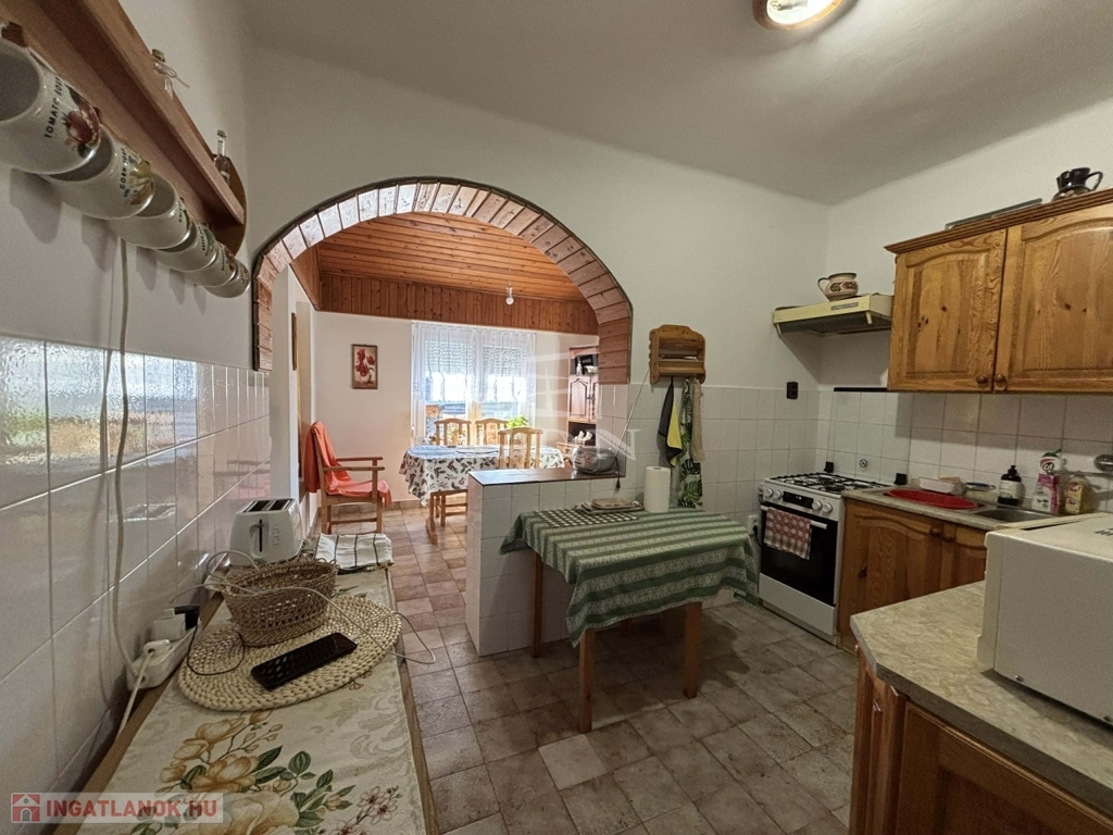 Az 1993-as tégla építésű ingatlan földszintjén 2 szoba, konyha, kamra, nappali, előszoba, fürdőszoba és tároló helyiség került kialakításra.