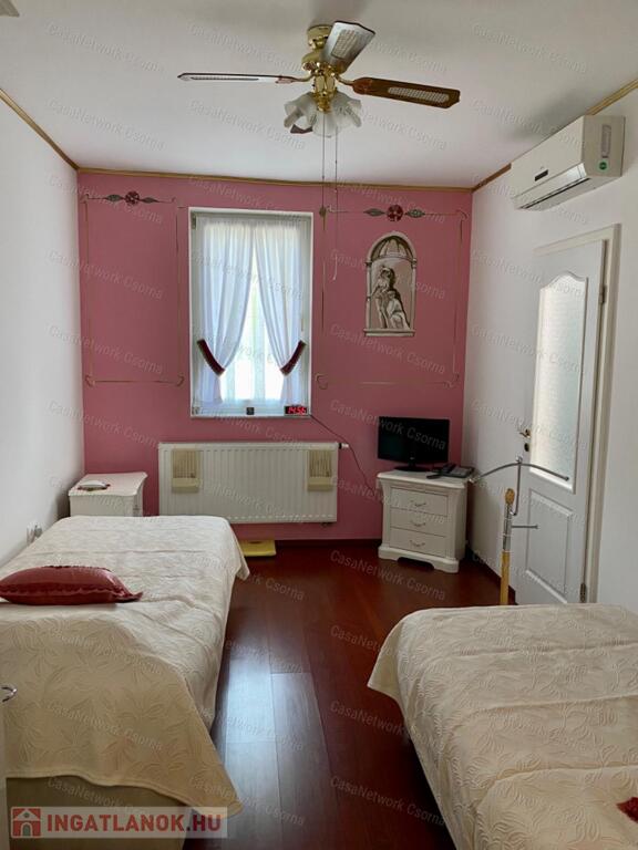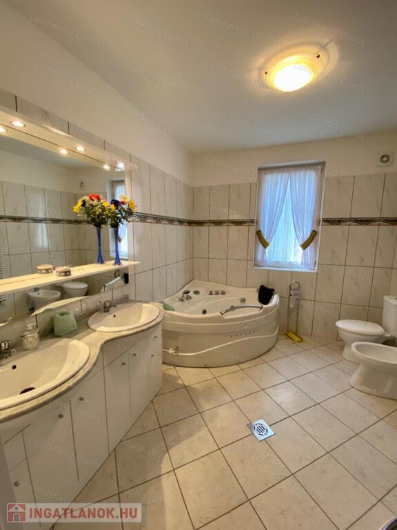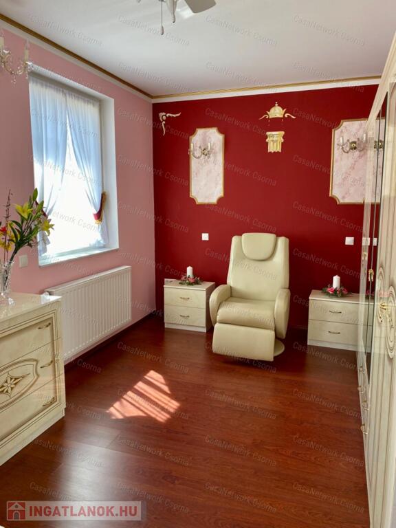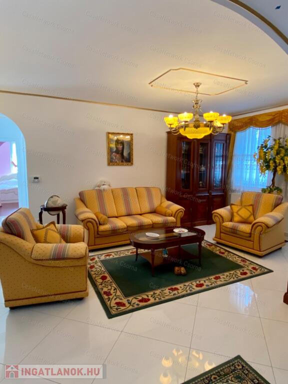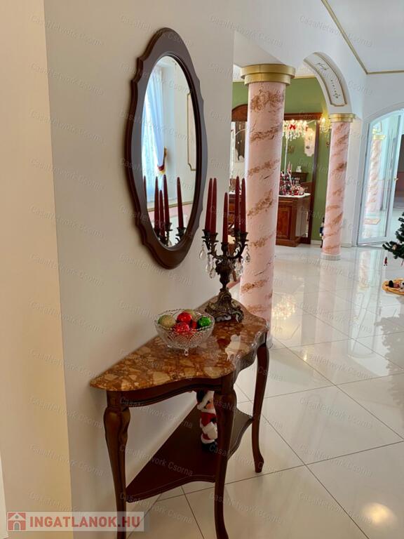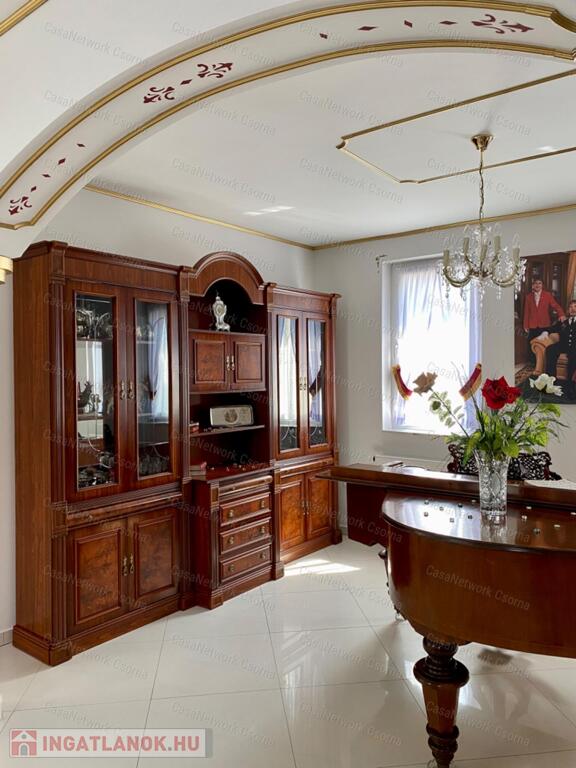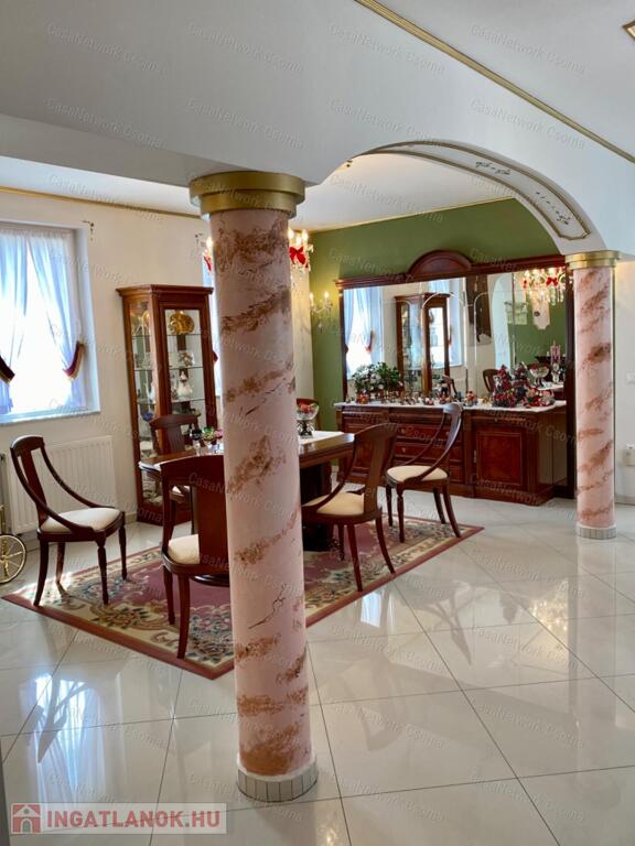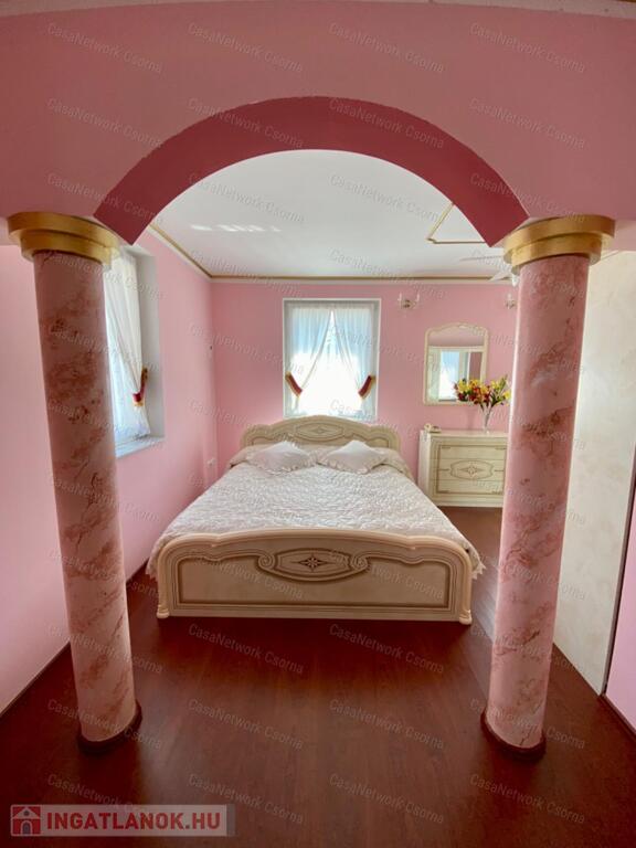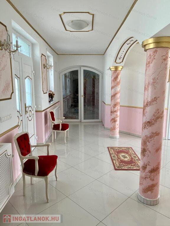 A kastély 3 csillagos amerikai stílusú kastélyszállóként üzemelt, melyhez 5 szoba tartozik, 20 fő elszállásolására van lehetőség. A szobák az udvarból nyílnak, így a saját lakóterülettől függetlenek. Ezek a szobák üzemelhetnek újra szállóként, vagy: tárolóként, hobbiszobaként, vendégszobaként. Mindegyik saját fürdővel rendelkezik. Felszereltsége: tv, hűtő, ventilátor, asztal, főzőlap.A lakótér szintén amerikai stílusban készült el, 3 hálószoba fő hálóval mindegyikéhez tartozik fürdőszoba,plafon ventilátor, többségében klíma. Továbbá amerikai stílusjegyek szintén felfedezhetőek az amerikai dupla konyhában, mind a bútorzat, mind a gépesítés duplán lett beszerelve. A kastélyban tovább sétálva találhatunk olvasó szobát, zene szobát ahol zongora található meg (1870-es évekből származó 100%fa zongora), gardróbot, nem maradhat el a társalgó, szalon sem. Továbbá felhívnám figyelmét az igényes, minőségi anyaghasználatra, amitől ez az ingatlan igazán értékes lesz: -réz kilincsek, márvány párkányok belül, réz kívül, kristály üveg ajtók, selyem függönyök,  24k aranyozott festések, oszlopok (14db) festése (művészek által festett, motívumok szintén), festmények, motívumok, alumínium ereszek, kettős hódfarkú kastélycserép, réz féltorony, alumínium zsalugáterek, mahagóni laminált padló, a korhű bútorok és csillárok Spanyolországból származnak, mindenből a legmodernebb a gépesítést figyelembe véve. Ezeket tekintve bizonyosodik be, hogy az ingatlan hosszútávra épült, energiát és pénzt nem spórolva.Fűtésrendszere gázkazánnal és elektromos fűtéssel megoldott, két szárnyban külön-külön megtalálható a kazánház. A kastély erős alapokra épült, pénzt nem spórolva szakszerűen emelték meg a telek magasságát 1,8m-el. Az ingatlan tovább bővíthető,, megemelhető egy szinttel. Így az alapterület megduplázható, jelentősen pénztárca kímélőbben. Ipari áram a garázsba bevezetésre került. 2 fúrt kút ad vízellátást az antikolt szökőkutaknak, amelyek idényszerűen biztosítják a kellemes hangulatot az udvarban. A monolit vasbetonból  födém minden statikai követelményt kielégít. A 2 külön szárny tűzzáró ajtókkal lett elválasztva egymástól a nagyobb biztonság érdekében. 8cm szigetelést és nemesvakolatot kapott a ház kívülről. 3,5 férőhelyes garázsban több autó is kényelmesen elfér. A kastély mellet található közművesített 720m2-es építési telek szintén eladó a kastéllyal együtt +30 millió ft-ért. Amennyiben felkeltette figyelmét az ingatlan, vagy kérdése
