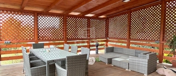 2. szint: földszint (88 m2) galériás nappali, konyha-étkező, előszoba, wc, fürdőszoba, háztartási helyiség, hálószoba + 40 m2-es fedett terasz