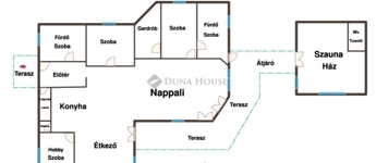 Földszinten található 3 hálószoba, gardrób, egy légtérben nappali, konyha, étkező, kamra, 2 db fürdőszoba.