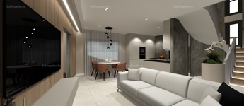 Kaposváron a Kisgát városrészben, a Reményik Sándor utcában, modern környezetben lévő, új építésű, exkluzív - magas minőségben kivitelezett, korszerű építőanyagokból épülő 4-lakásos Villaparkban - 123,82 m2-es kétszintes családi ház eladó. A lakóház földszintjén (75,62 m2) előszoba, nagy üvegportállal rendelkező tágas nappali - étkező, konyha, 1 szoba, gardrób, fürdőszoba-wc, további wc, gépészeti - tároló helyiségek kerültek kialakításra, továbbá tartozik hozzá egy 20,7 m2-es fedett, belső udvar felé néző terasz is - süllyesztett jakuzzival. Az épület felső szintjén (48,2 m2) előszoba, 2 szoba, fürdőszoba-wc és háztartási helyiségek, illetve 20,77 m2-es nyitott terasz vannak. Az épület felső szintjén (48,20 m2) előszoba, 2 szoba, fürdőszoba-wc és háztartási helyiségek, illetve 20,77 m2-es nyitott terasz vannak. A korszerű, modern energetikájú - alacsony rezsivel rendelkező - épület villany ellátása H tarifával megoldott, a fűtése LG típusú hőszivattyúval kerül kivitelezésre, továbbá fan-coil rendszer biztosítja a helyiségek fűtését és hűtését. Távirányítással működő zsaluziák lesznek felszerelve, illetve prémium minőségű szaniterek és szerelvények, illetve csapok - Wellis, illetve HansGrohe - kerülnek beépítésre. Az igényesen kialakított udvaron tartozik a lakáshoz 1 db fedett gépkocsibeálló és további 1 db kocsibeálló. Az épület teljes kivitelezését - és várható 2026. III. negyedévben történő átadását - követően a - komoly referenciákkal rendelkező - beruházó végzi majd a Villapark közös költséggel járó üzemeltetését is. A lakáshoz tartozó önálló udvar mérete: 397,50 m2