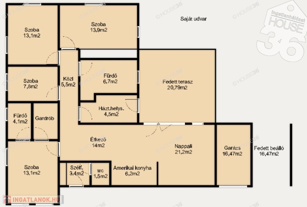 Az egész ház 152,11 m2, ebből 119 m2 a ház, egy 16,47 m2-es garázs és egy ugyanekkora fedett beállóval, és egy 21 m2-es terasszal.