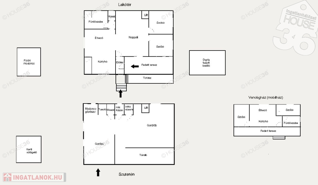 - szuterén: nagy fűtött garázs, zuhanyzó, mosdó, infrakabin, gépészet (medence ill. lakóház), óriási tároló helyiség (jelenleg gardrób szoba) - lakrész kialakítható