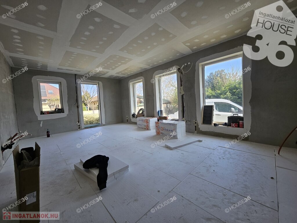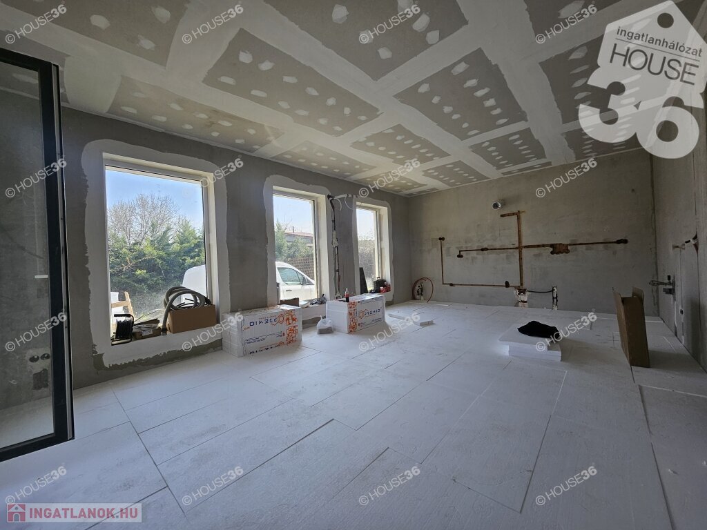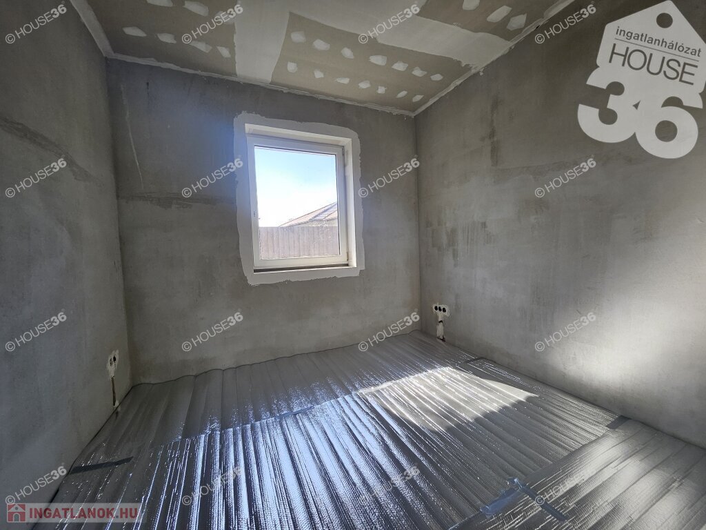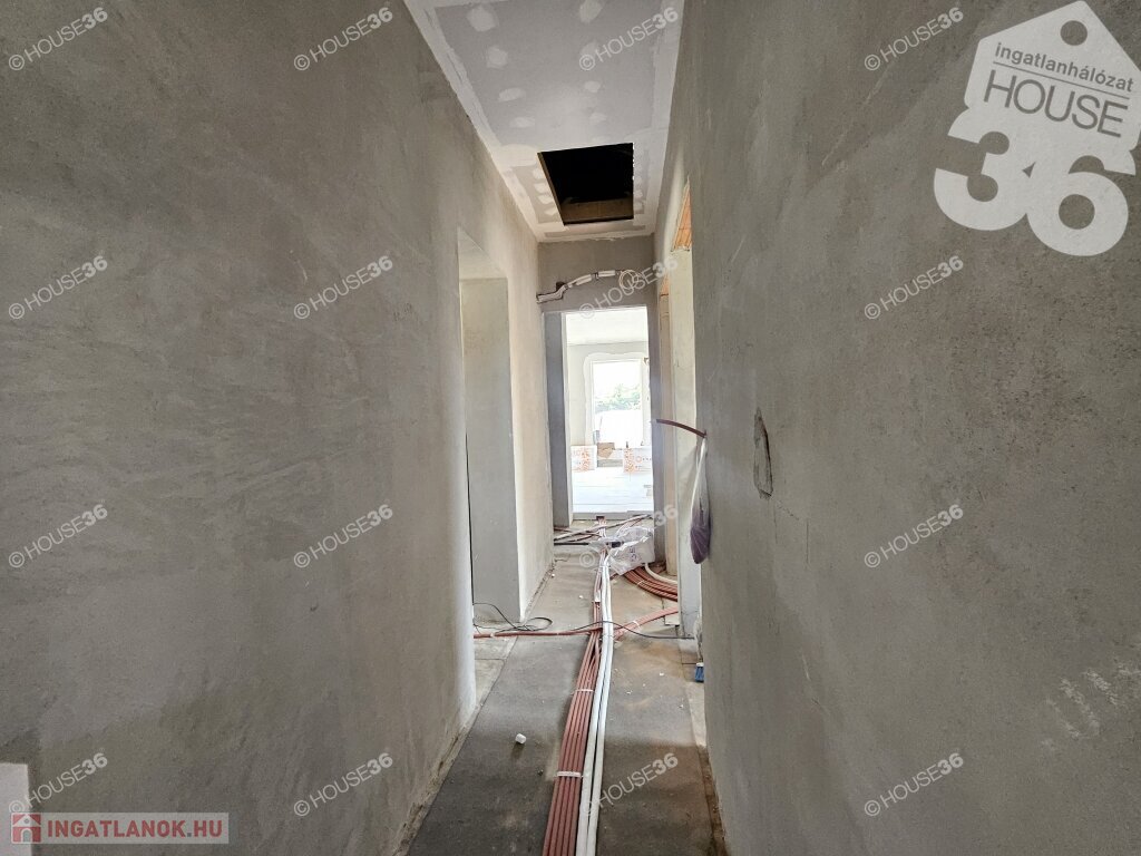 Kecskeméten, a Hunyadiváros újépítésű részén, aszfaltozott utcában, hátsó, nyeles, osztott telken (használati megosztással), 519 m2-es, teljesen körbekerített telken, 95,69 m2-es, nappali + 3 szobás családi ház, 2026 nyári átadással eladó! Jelenleg a ház már tető alatt áll, gépészeti-és burkolási munkák folynak.