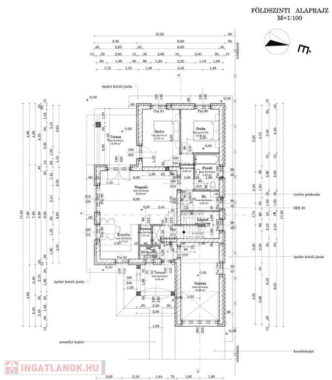 FÖLDSZINT: 1 amerikaikonyhás nappali étkezővel, kamra, 2 szoba, 1 mosókonyha/kazánház, 1 fürdő, 1 toalett, 1 szélfogó, közlekedő, valamint egy garázs az utcafronton (19 m2-es, melyen keresztül be lehet jutni a lakótérbe). A nappaliból nyílik egy fedett 15 m2-es terasz a hátsó udvarra, valamint a bejárati ajtó előtt ismét egy 5,4 m2-es teraszon jutunk be az ingatlanba.