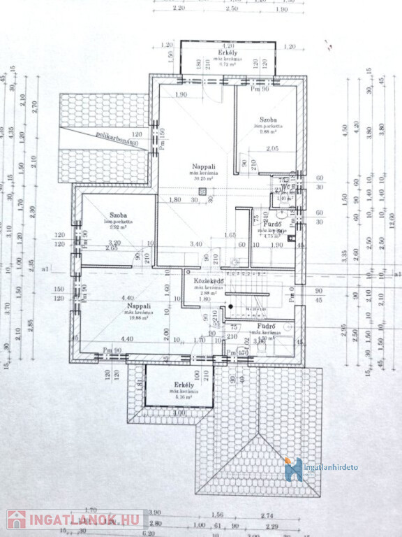 Tetőtér beépíthetősége 84 m2, erkély 7 m2 és 5 m2.