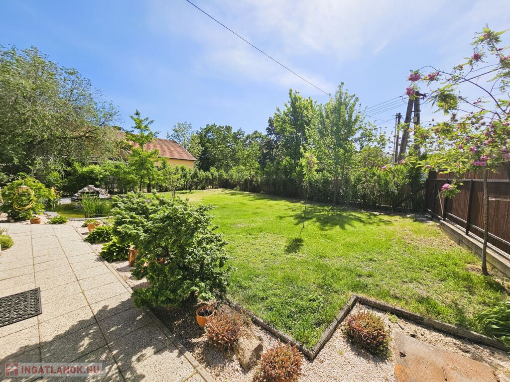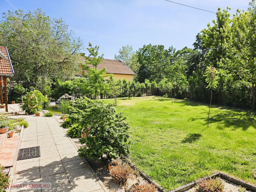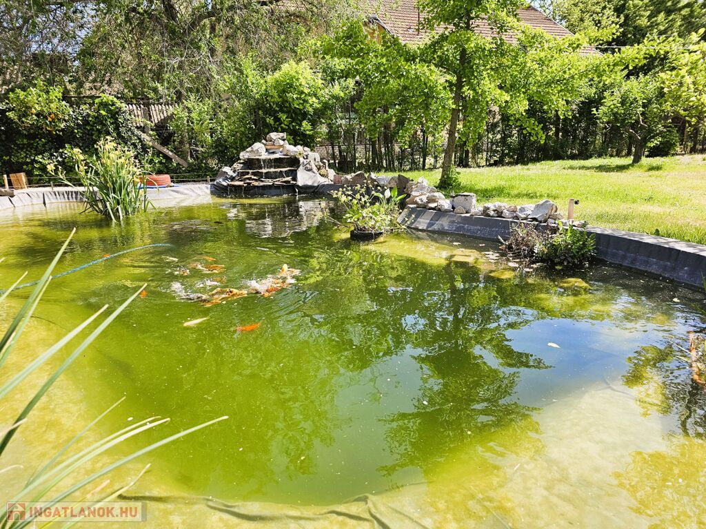 Az igényesen parkosított udvarban található egy 7x3 m-es dísz halas tó csobogóval, mellette egy 28 m2-es fedett terasz, kerti kiülő .