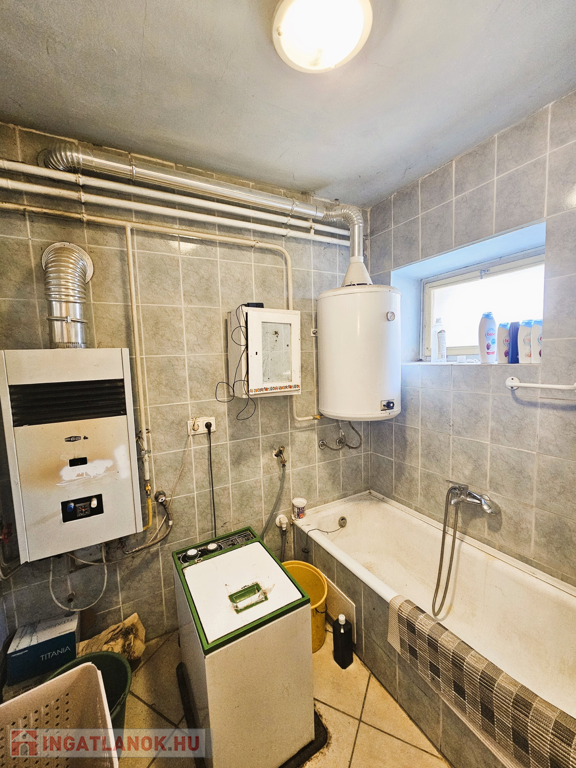 A fűtésről gázcirkó kazán és radiátorok gondoskodnak, a meleg vizet gázbojler biztosítja. A ház elosztása praktikus: három szoba, közlekedő, konyha-étkező, spájz, fürdőszoba és külön WC található benne.