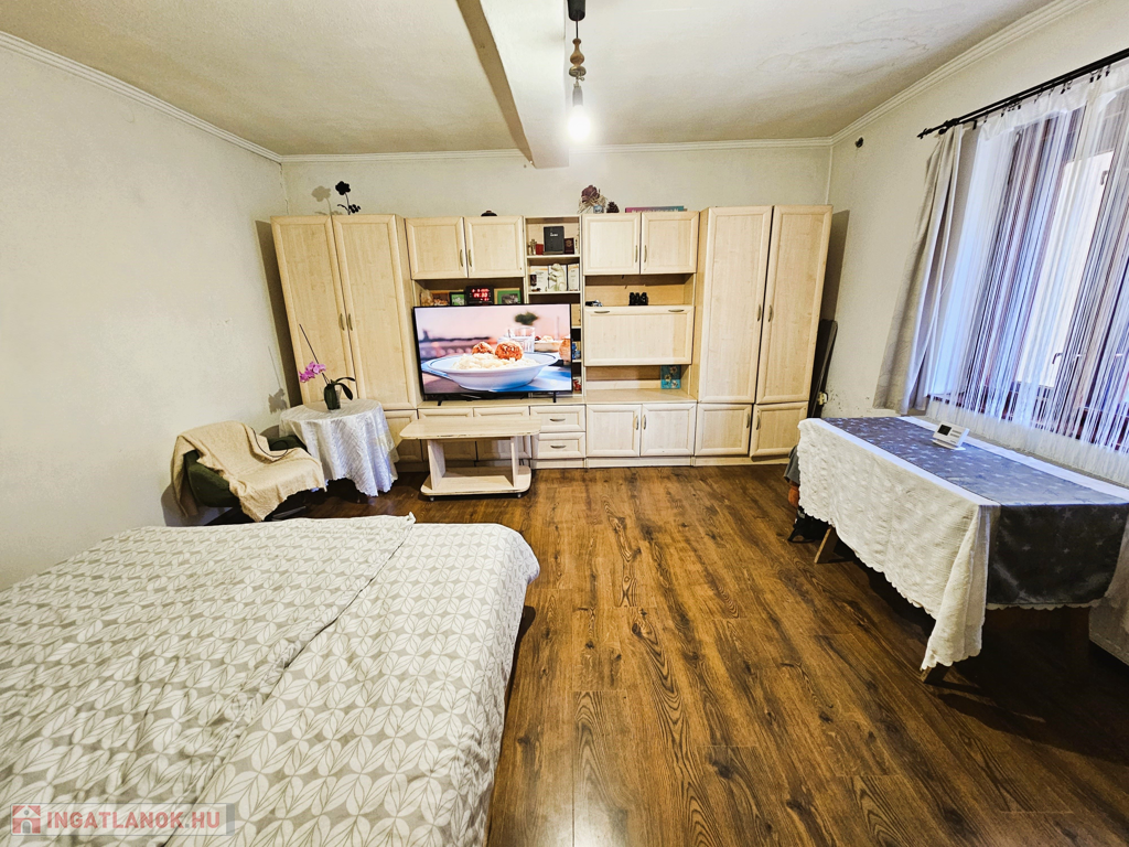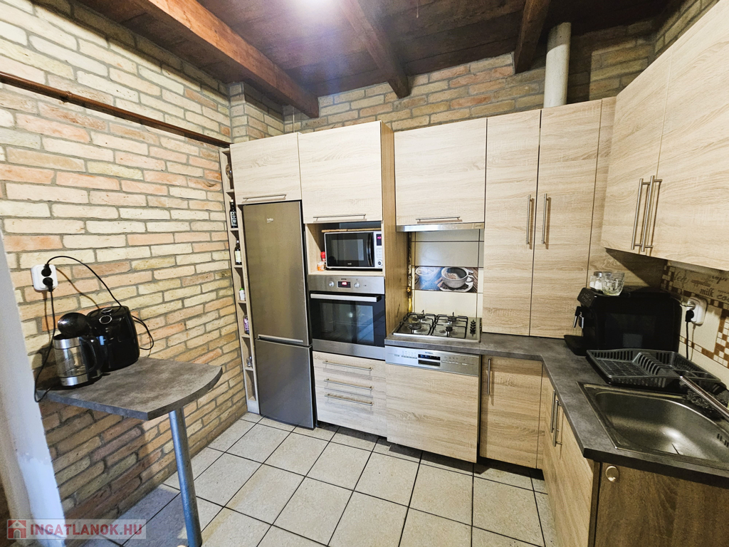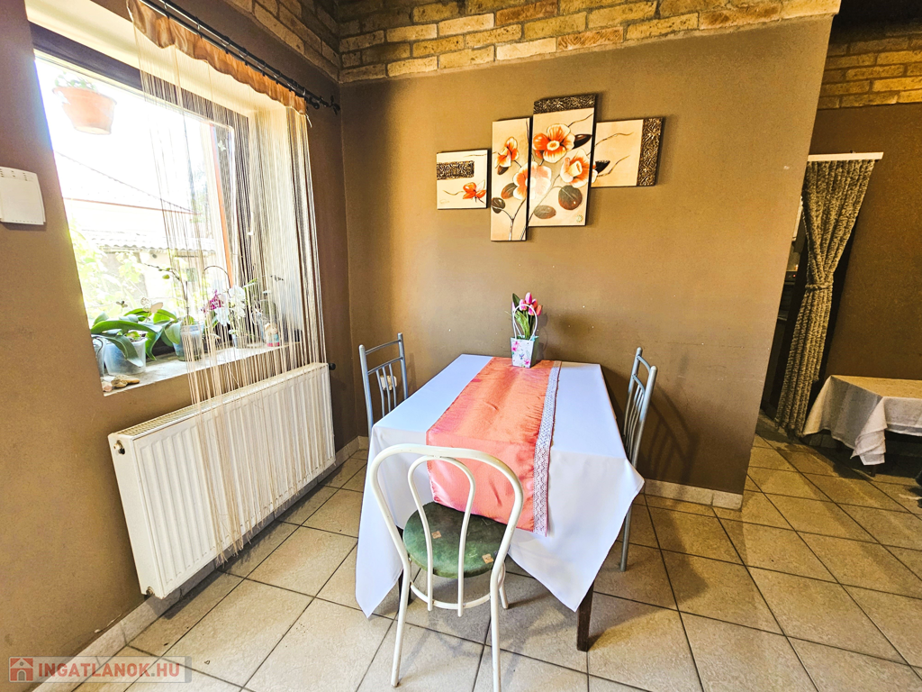 Kiskunhalas belvárosában, saroktelken eladó egy 67+33 m2-es családi házrész garázzsal. Az ingatlan vegyes falazattal épült, tetőszerkezete cserépfedésű, a nyílászárók eredeti fa szerkezetűek. A fűtést gázcirkó kazán és radiátorok biztosítják.