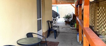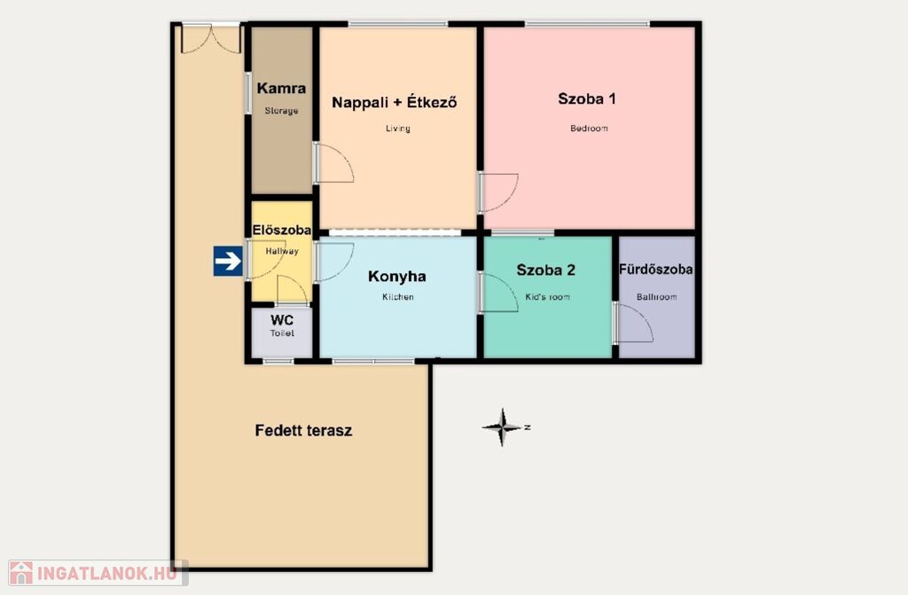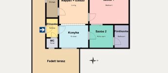 Az ingatlanban 2 hálószoba, nappali, fürdőszoba, külön WC, 25 m2-es fedett terasz és egy tároló található.