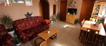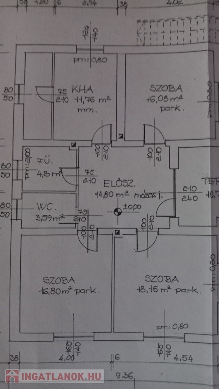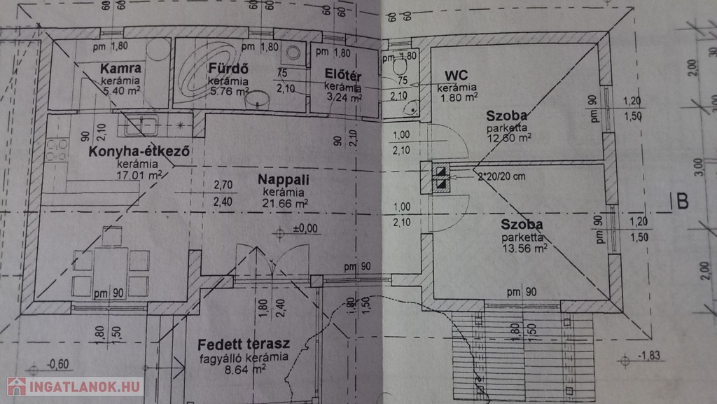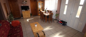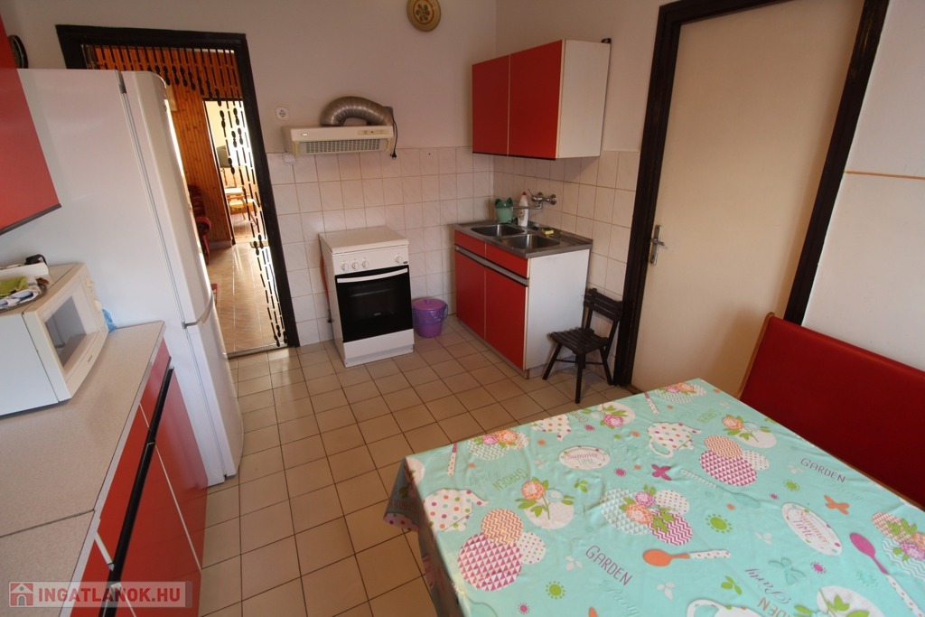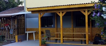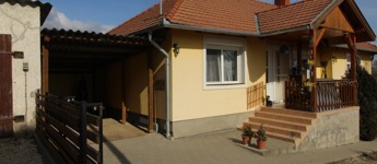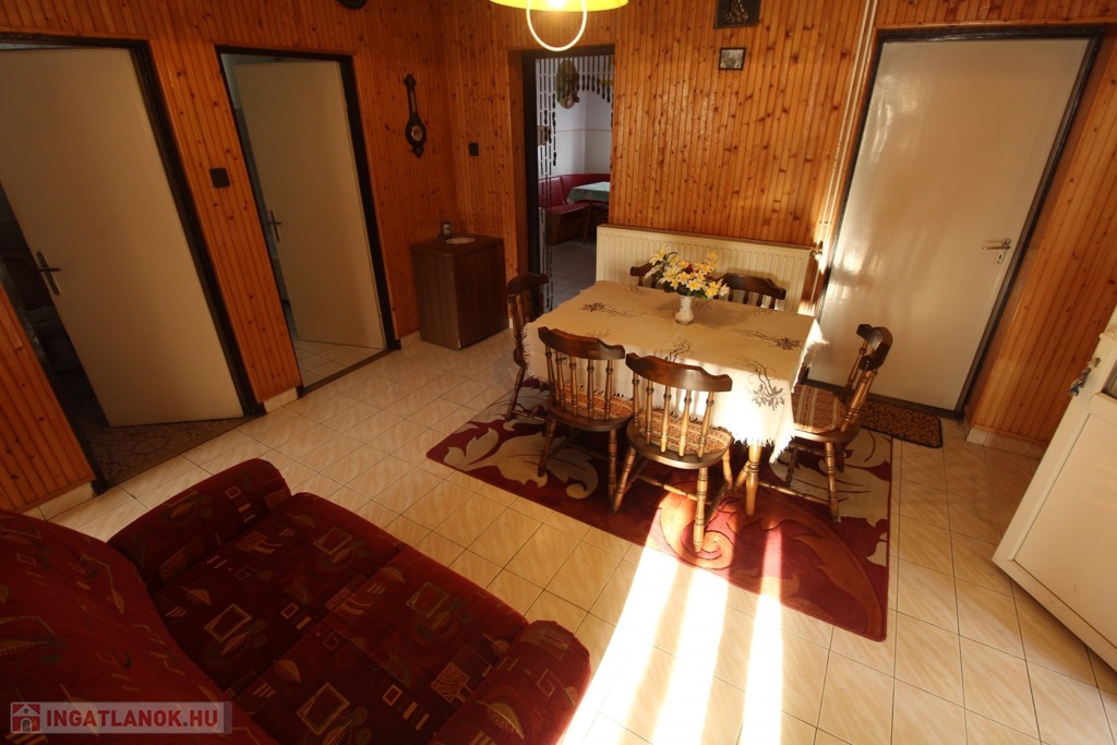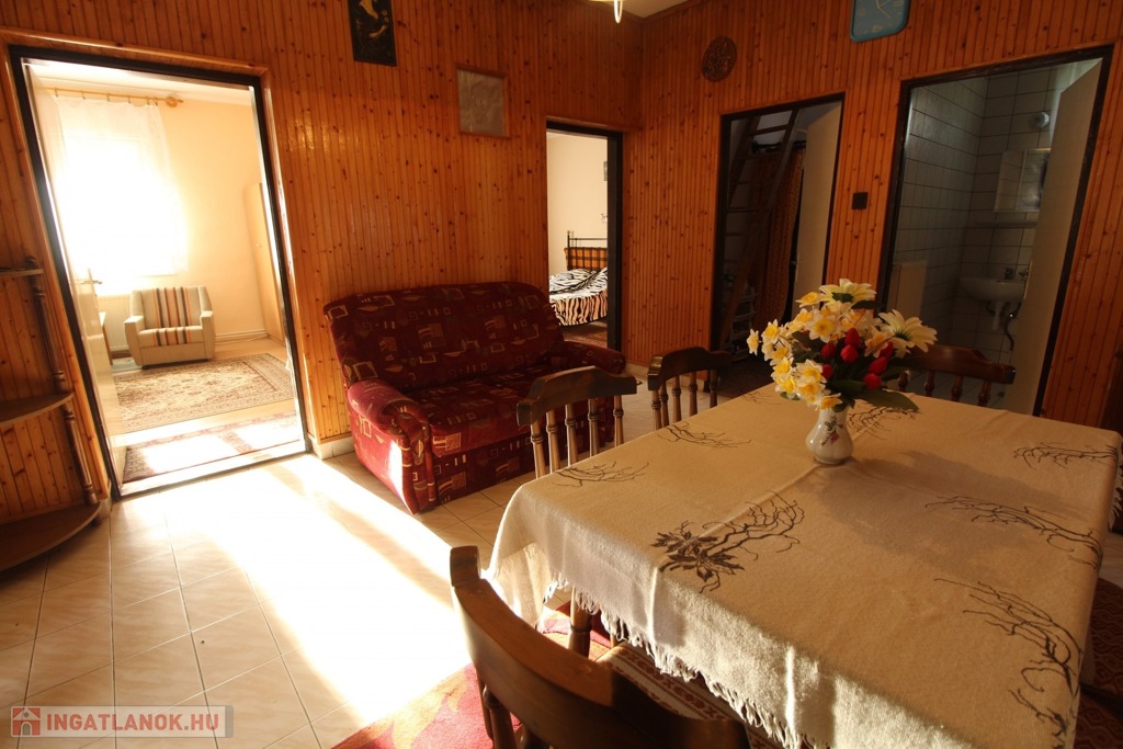 Elosztása: fedett terasz, nappali, konyha, mosószoba, fürdő, illemhelyiség, és 2,5 szoba.