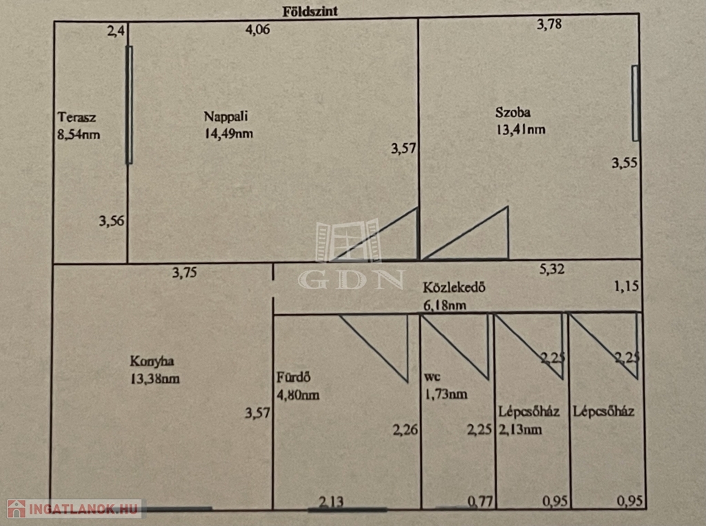 - Földszint: konyha–étkező, nappali, szoba, fürdőszoba, külön WC, közlekedő, lépcsőház, terasz