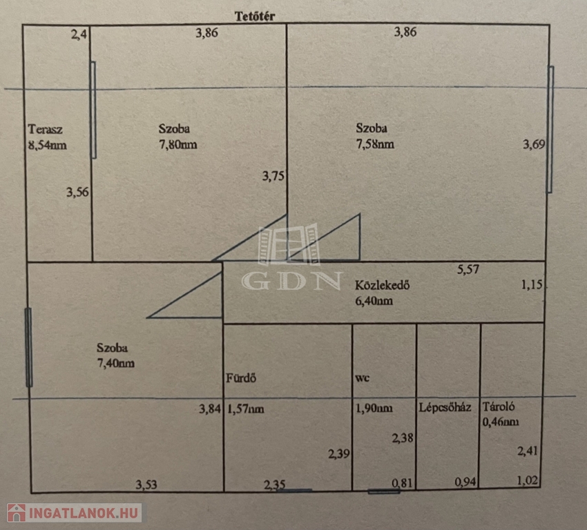 - Emelet: 3 szoba, fürdőszoba, külön WC, tároló, terasz