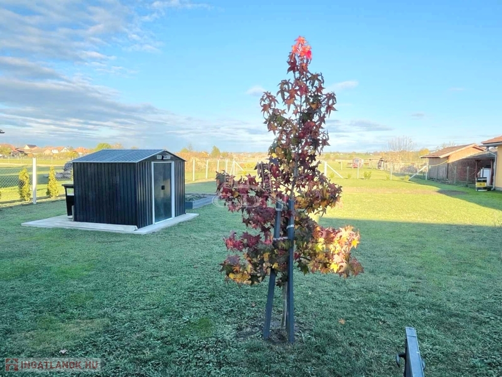 A teljesen sík, gondozott, bekerített telek biztonságos és kellemes környezetet biztosít, ahol a tágas terasz, a fedett kocsibeálló és az esztétikus tároló is a kényelmet szolgálja.