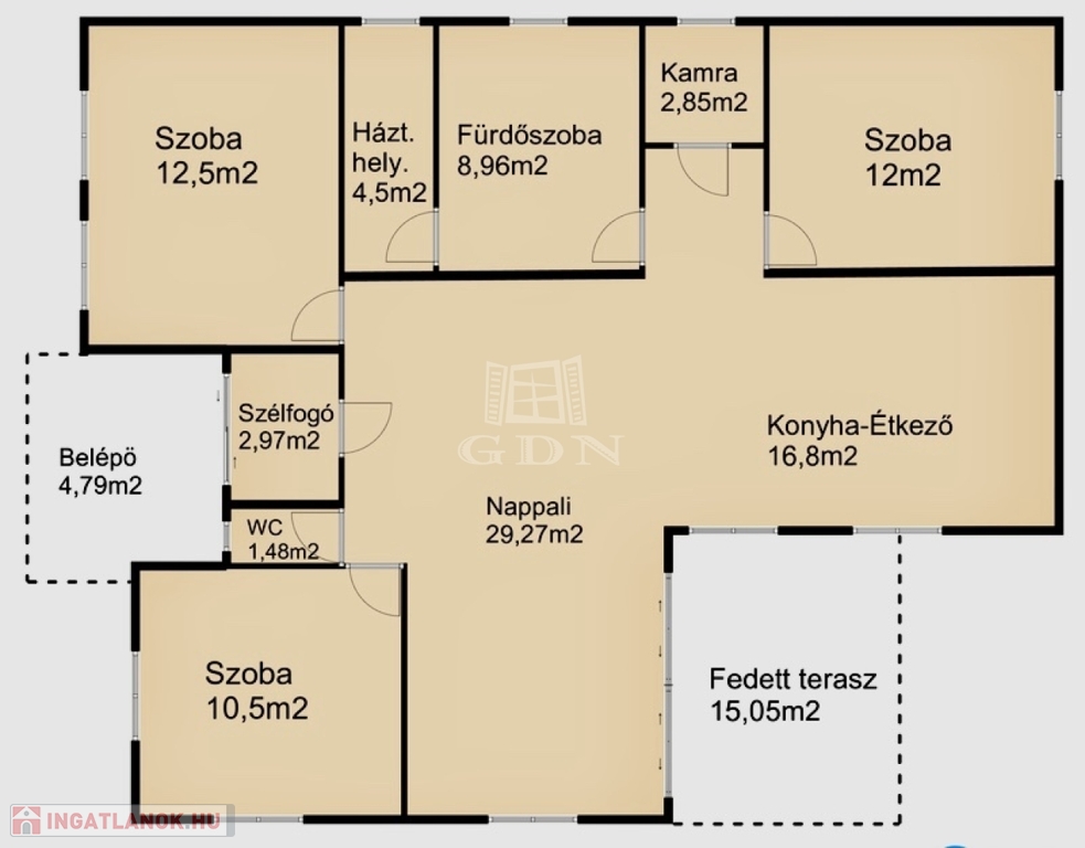 A tágas, napfényes otthon 3 kényelmes szobából, egy világos, teraszkapcsolatos amerikai konyhás nappaliból, elegáns, zuhanyzóval ellátott fürdőszobából, külön helyiségben lévő toalettből, valamint egy praktikus mosókonyha helyiségből áll - ideális elrendezéssel, amely a családi élet minden igényét kielégíti.