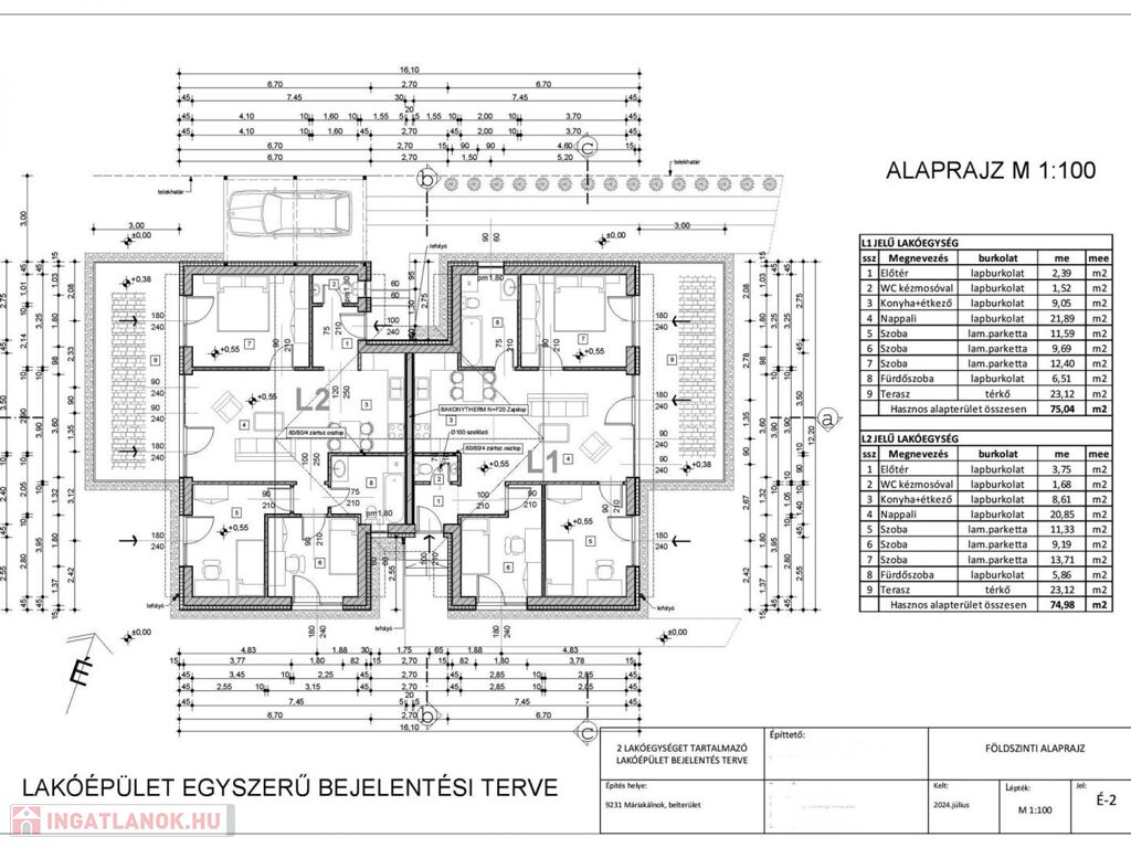 A 74,98 m2-es, L2 ház helyiségei: amerikai konyhás nappali, 3 hálószoba, fürdőszoba, WC, előtér, és 23 m2 terasz. Az ingatlanhoz tartozik 1 db fedett kocsibeálló.