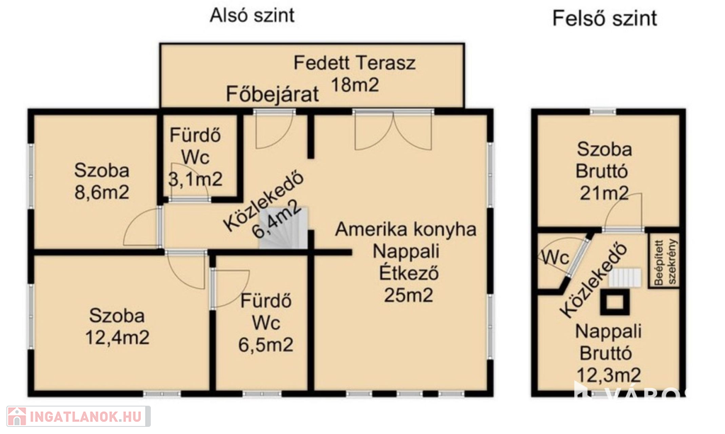 A családi ház alsó szintjén kialakításra került 2 külön bejáratú szoba, melyek közül az egyikhez saját fürdőszoba is tartozik, egy közlekedő, fürdő mellékhelységgel együtt, amerikai konyha nappali étkező közvetlen teraszkapcsolattal. Felső szinten található egy nagy szoba, egy nappali, és egy mellékhelység.